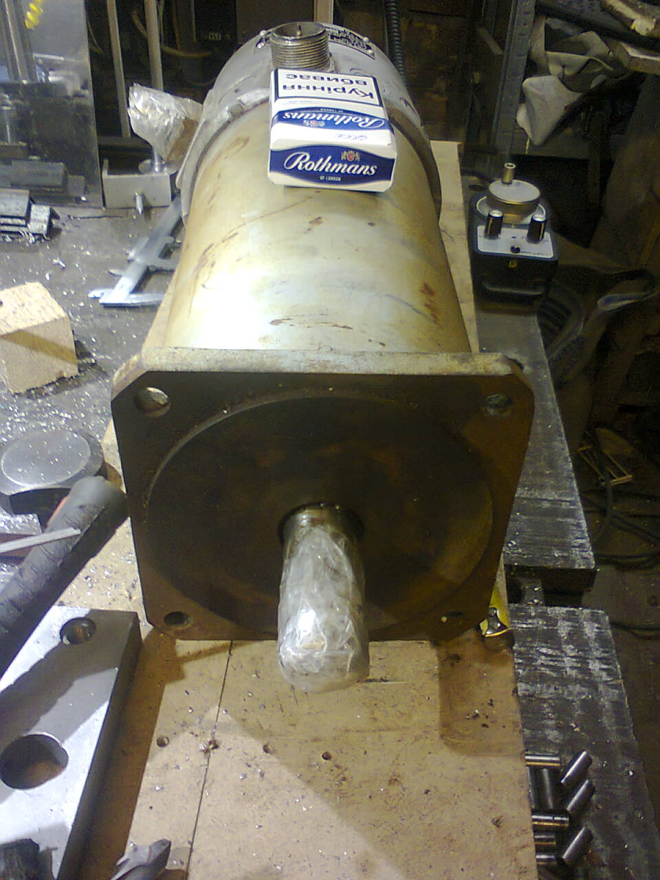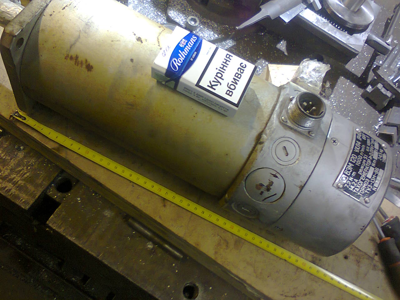 Приехал такой вот пупсик на 25кг Фланец: квадрат 140мм, длинна без вала 400. На ламелях даже мелких царапок нет от следов работы. Новьё. Внутри стоит какой-то странный механизм, жужжит. Я так понял, некое подобие тормоза, снижающее инерцию при свободном вращении. Подключил к блоку питания на 40В. Крутит, шо дурной. При старте сильно подпрыгивает. Если б это какой мелкаш был, не смутило бы, а так будет весь станок вместе с мотором подпрыгивать, особенно при реверсе, придется к полу прикручивать. Ну да ладно. В любом случае двигло знатное. Чем больше моща, тем плавнее ход и чище поверхность, что и требуется. Понёс его к станине приложить и понял, что кроме, как сзади, по другому примастырить не получится. Чтоб упрятать в корпус станины и речи нет, не пролазит