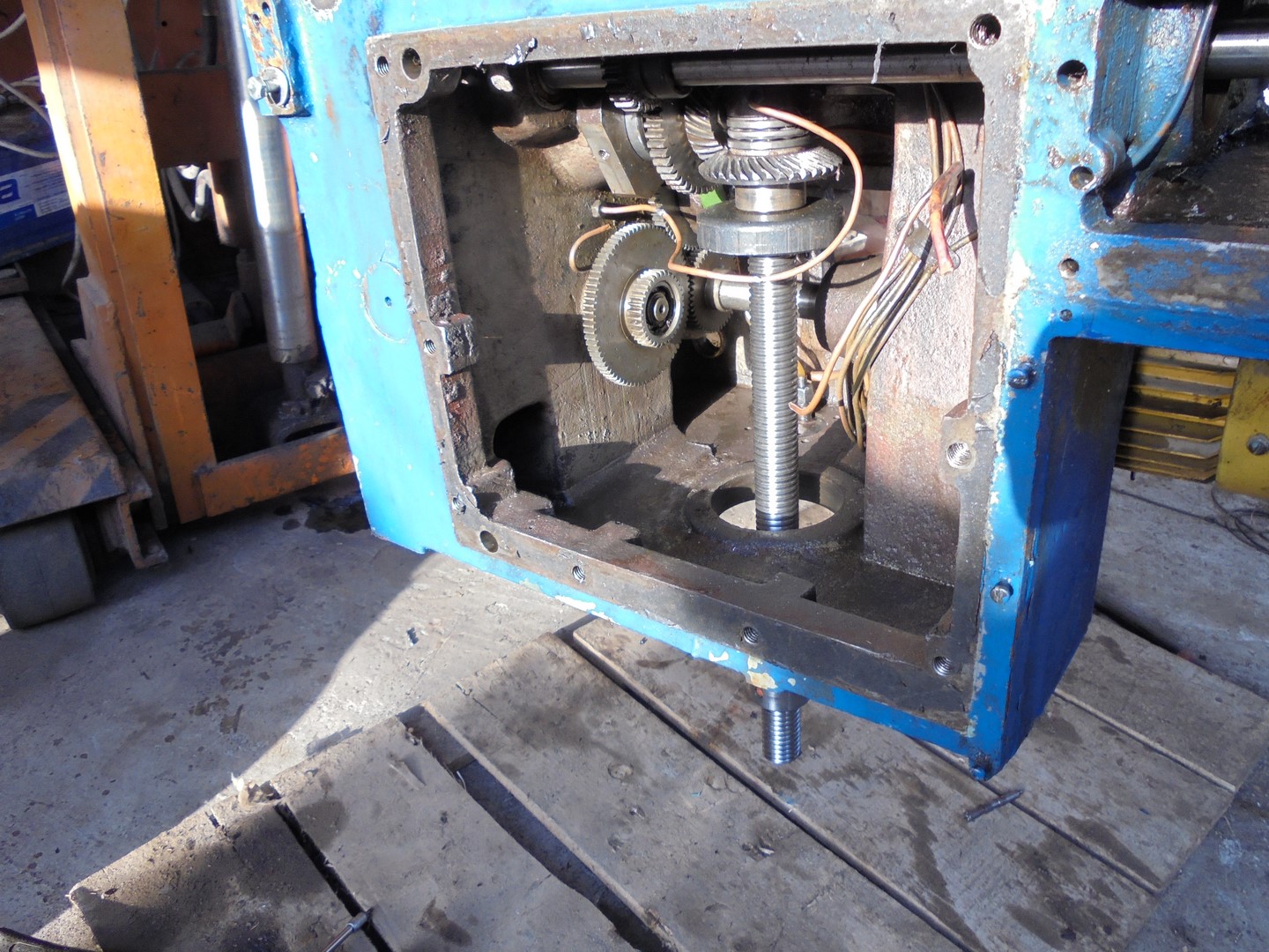 Он стоит щас там где удобно электрокарой подъехать, и подымать устанавливать нужные железки ;) У станка любая из осей довольно тяжеловата чтобы поднять одному человеку ;)
