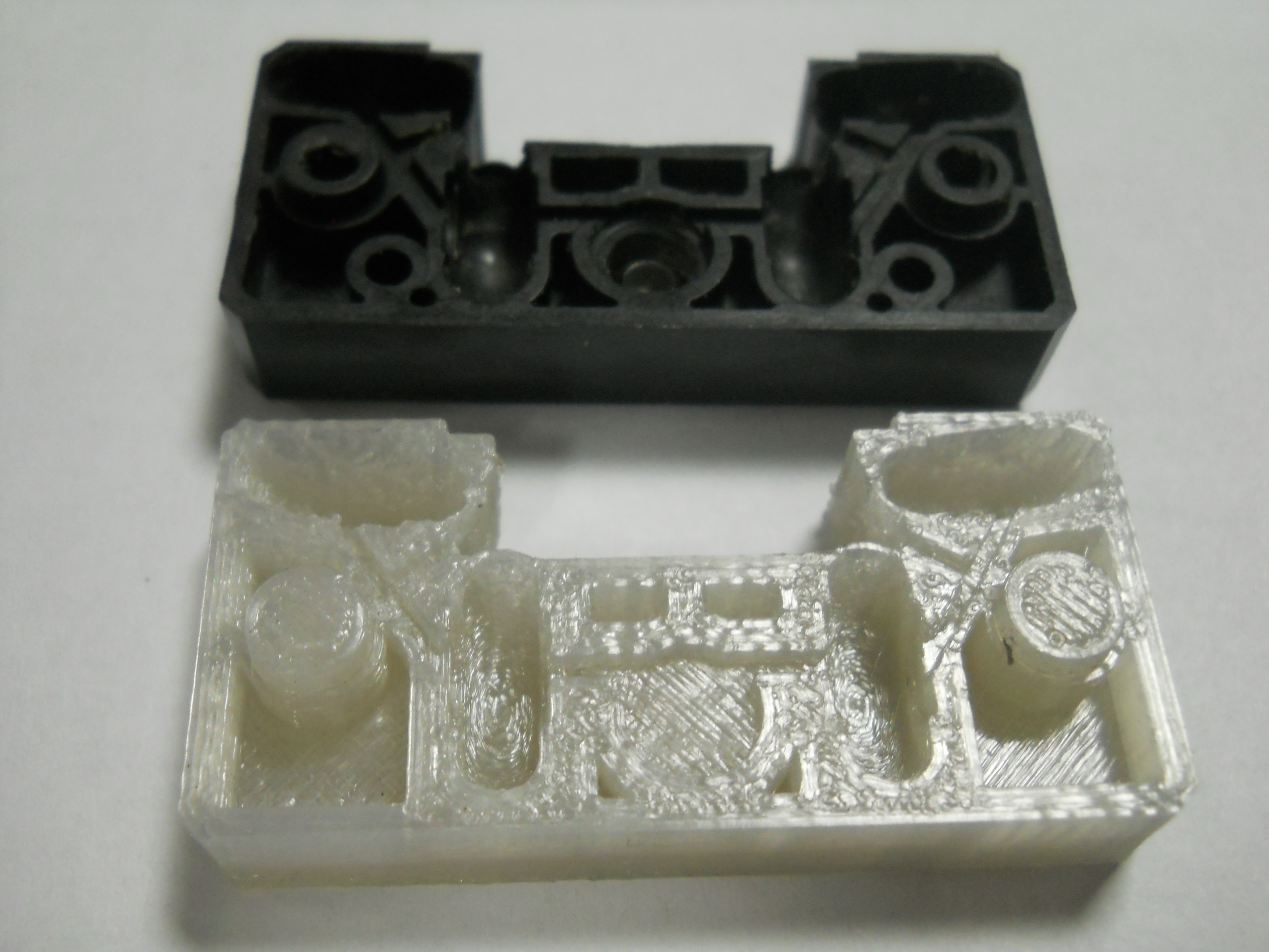 В одной канторе мне сказали, что есть поликарбонат. Почитал, немного смутила слабая бензо-масло стойкость, но выбор пал на него. Одну крышку напечатал для образца, чтобы понять усадку, подправил модель и со второго раза - попал. Но места под рельсы утолщил на подгонку надфильком. По первой опытной детали заметил, что тонкие места "съедаются".