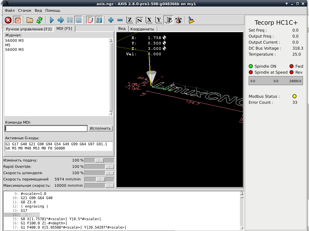 Не ожидал, что с первой попытки запустится... :thinking: Сделайте скриншот во время работы шпинделя, интересно посмотреть что там на панели в axis происходит.