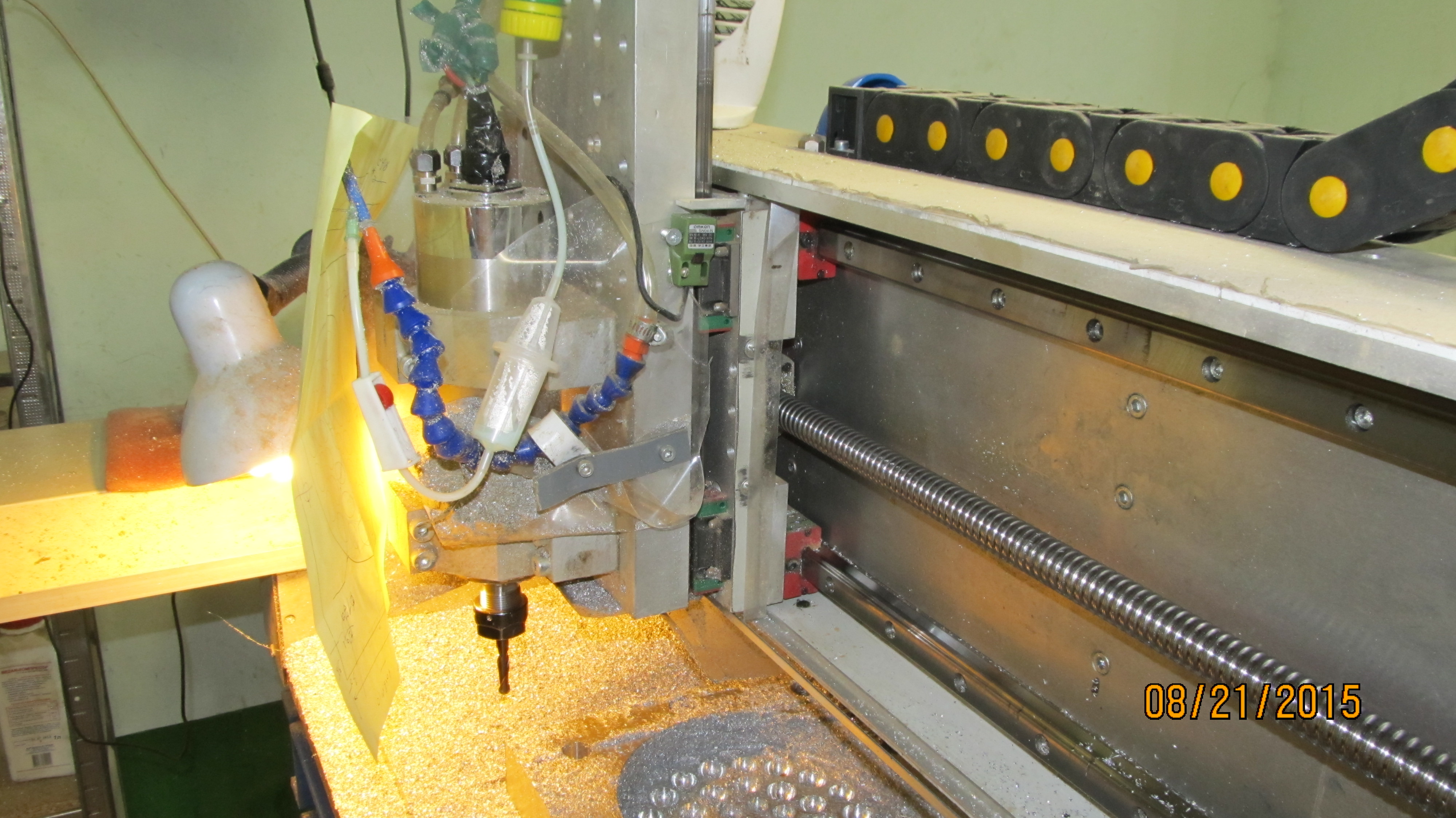 Это последний малыш, когда-то мой друг начинал делать, но так и бросил незаконченным, сейчас взяли себе помощника-студента, чтоб не гробить нормальные станки, дособрали этот - пущай тренеруется. Ничего особенного нет, но фрезерует понемногу, основы арткама и павермила на нем подучить вполне реально да первые шишки набить.