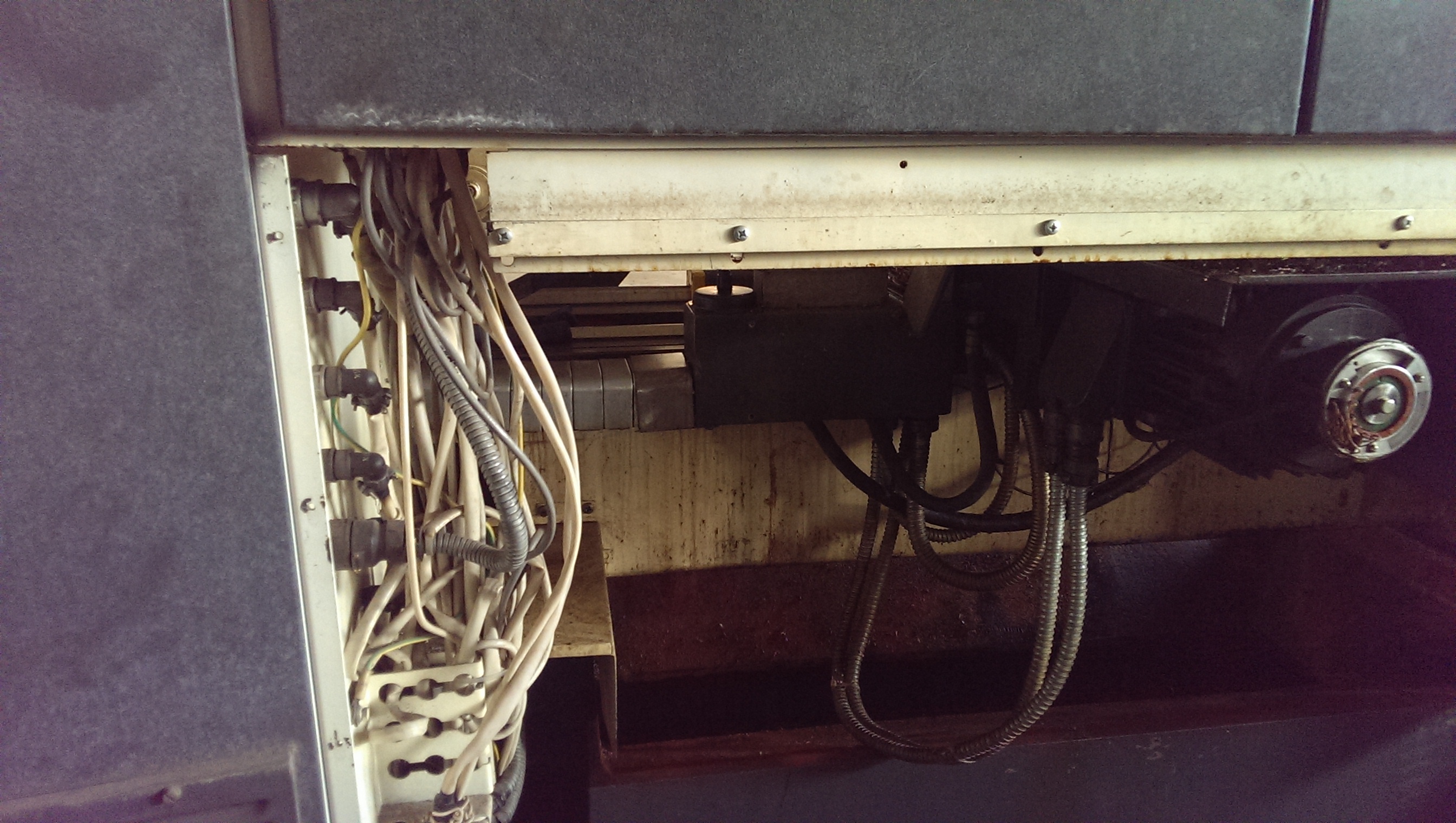 Под электрошкафами только один кожух на станке висит. Станок сейчас перевозят на другое место, поэтому часть кожухов снята. Сейчас станок в таком состоянии: