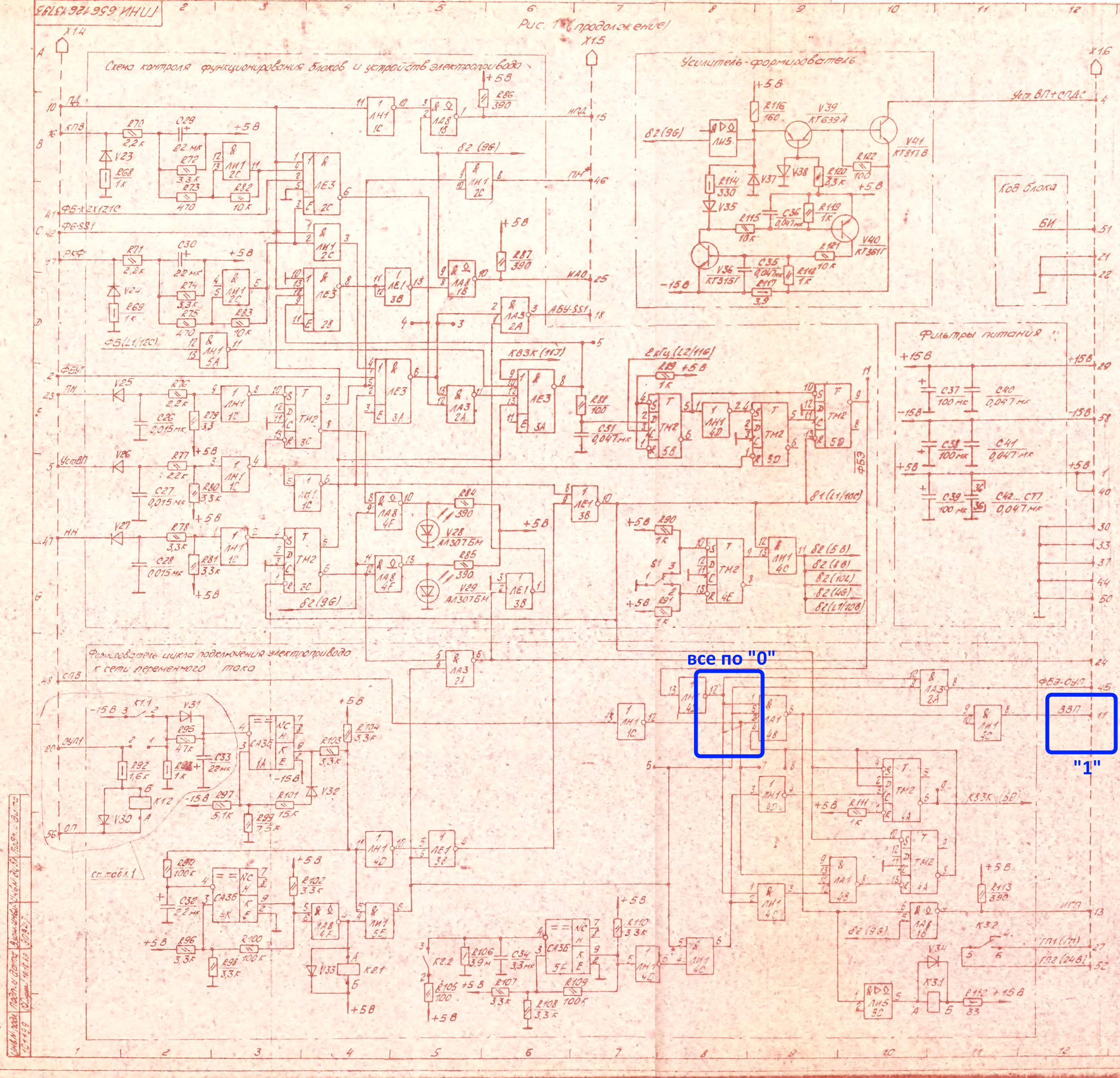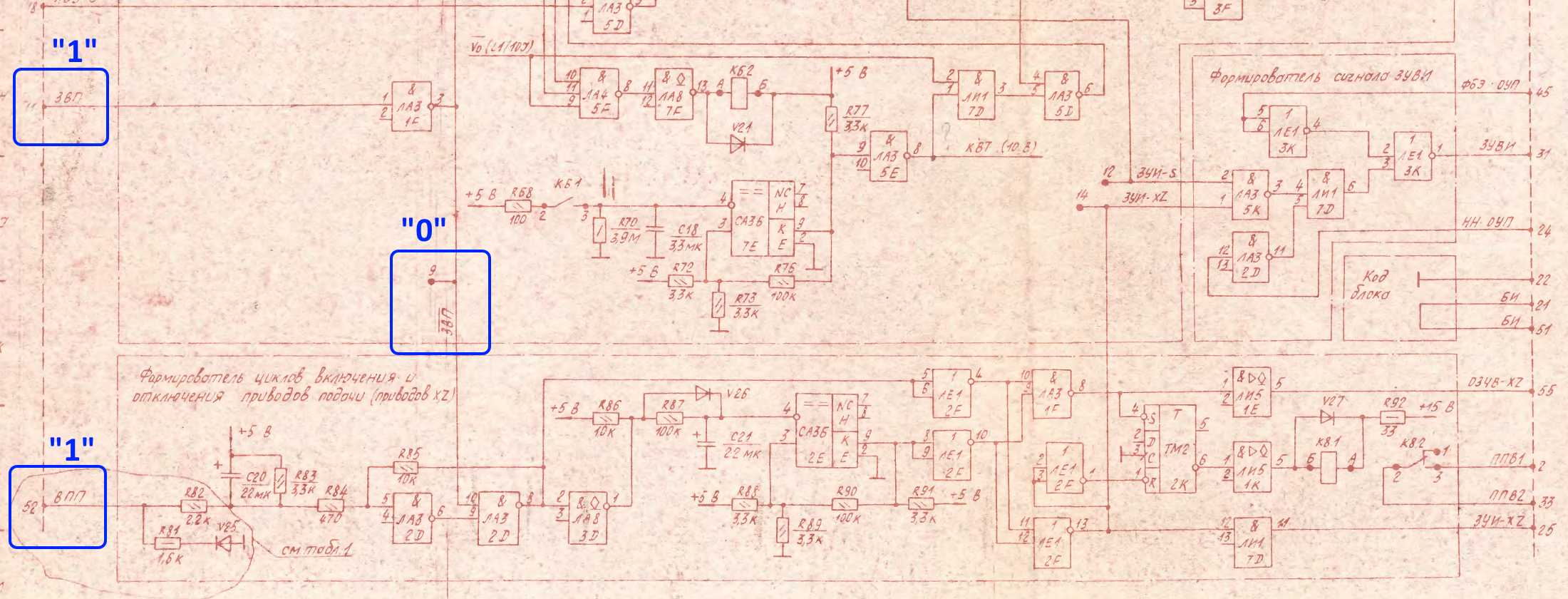 Проверил на пладе АГП1: есть вход ВПП, но нету инверсного сигнала ЗВП (запрет включения приводов): Сигнал ЗВП идёт с платы ДОС2. Проверил только сигналы до элемента "&" микрухи 4В (ЛА1) - на входе все 4 сигнала в "0" (точнее: один сигнал на первой ноге при первоначальном включении станка = "1" (3,77 Вольт), но как только нажимаешь кнопку на ЧПУ "Включить приводы" - гаснет в "0" и больше не включается до полного перезапуска станка. Остальные - всегда = "0"). Больше проверять времени не хватило.