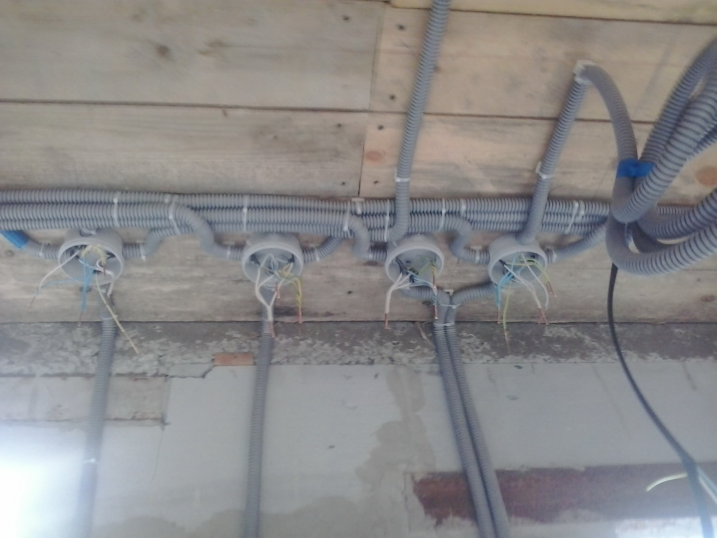 Ездили с братом делать электромонтаж, жилой комнаты 25м2 и коровника 45м2. Вдвоем, неспеша, сделали за три дня. Монтаж в трубе - это коровник, монтаж в гофре - жилая комната, которая будет обшиваться гипсокартоном. Все скрутки пропаял.