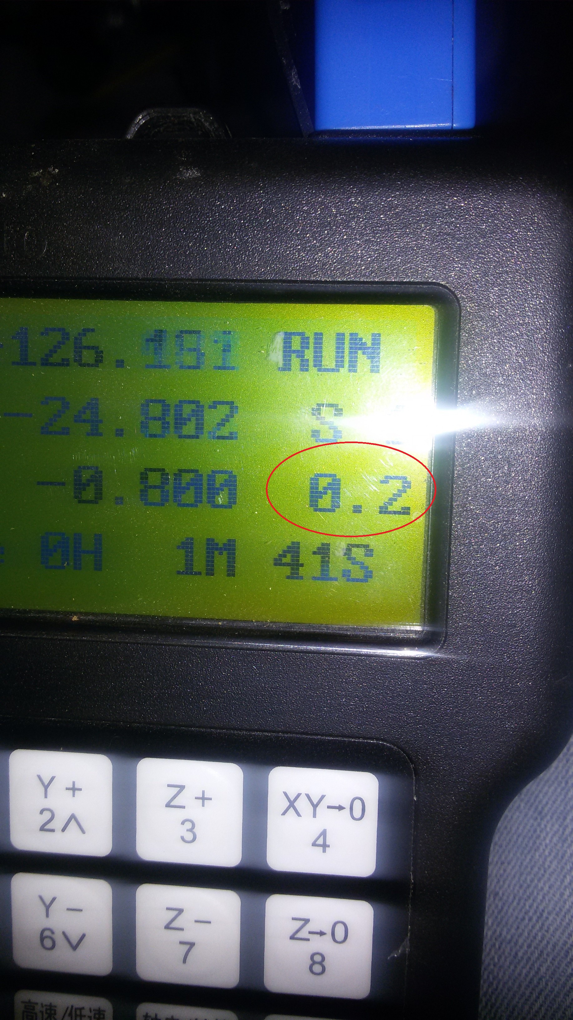 0.2 на фотке означает 20% от рабочей подачи, для нормальной работы должно быть, стессна, 1.0 - т.е. 100%. Возможно, это и есть ваша 2-я передача. Во время выполнения УП этот коэффициент скорости подачи можно менять кнопками Y+ и Y- (подробнее в инструкции).