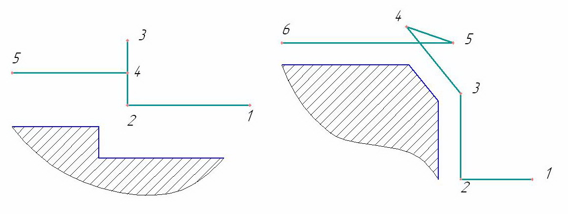 2 примера петель. заштрихован контур детали, толстой линией выделена характерная точка ан резце (центр радиуса при вершине например, но я рисовал не в масштабе, но для примера думаю понятно). резец движется с позиции 1 в 2, с 2 в 3 и так далее