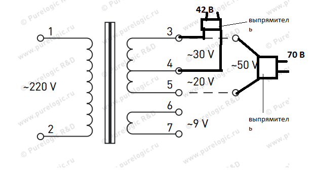 Если к трансформатор подключить к выводу 30 вольт выпрямитель получим 42 вольта.