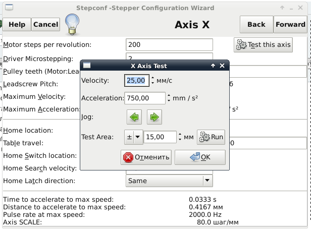 я щас уже точно не помню(а линукса под рукой нет) , по-моему эти параметры настраиваются автоматическиRazor писал(а):Параметры Step time, Step space, Direction hold, Direction setup Вот эти параметры не пойму что это . Есть что то похожее в Mach3? Ибо как настроить матч знаю.