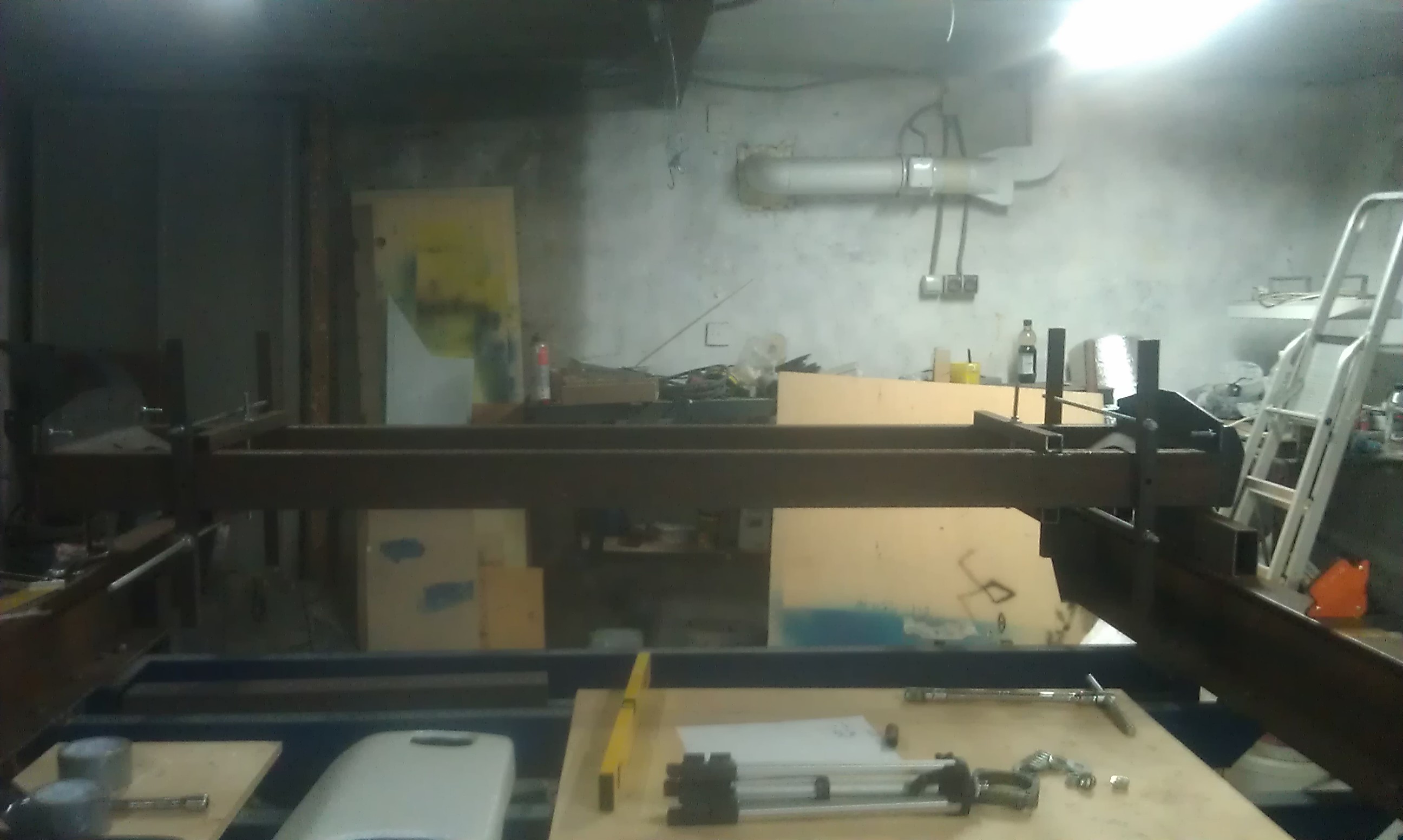 На втором фото поперечная стяжка далеко, надо 50 мм от пластины. Чурки, которые подложил, убери и притяни к 20 швеллеру струбцинами. Проверь угол труба-пластина должен, быть 90º