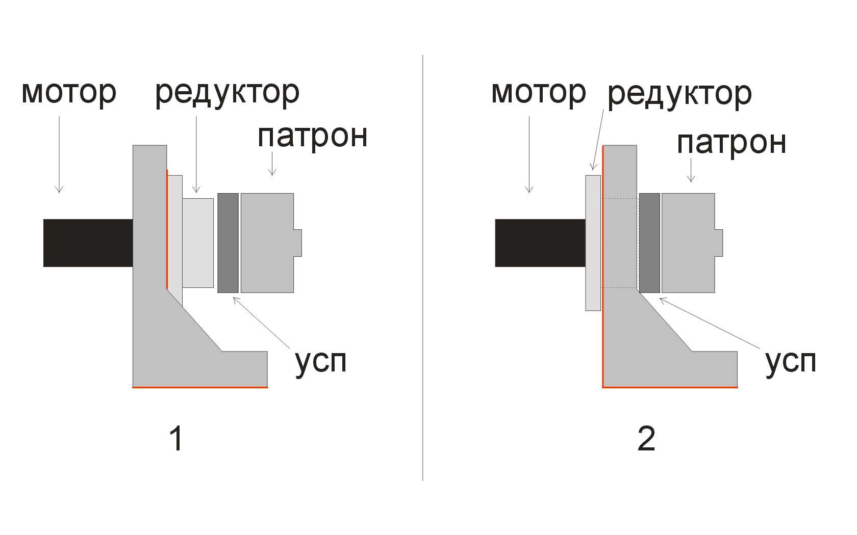 Идея в том, чтобы взять чугунную деталь в виде угла, отпескоструить, отшлифовать прямой угол, прорезать отверстие для редуктора (скажем, на 1мм больше его диаметра), закрепить его винтами по кругу таким образом, чтобы он "гулял" немного вверх-вниз и можно было точно выставить высоту относительно задней бабки. дальше закрепить на редукторе круг усп и на него патрон.