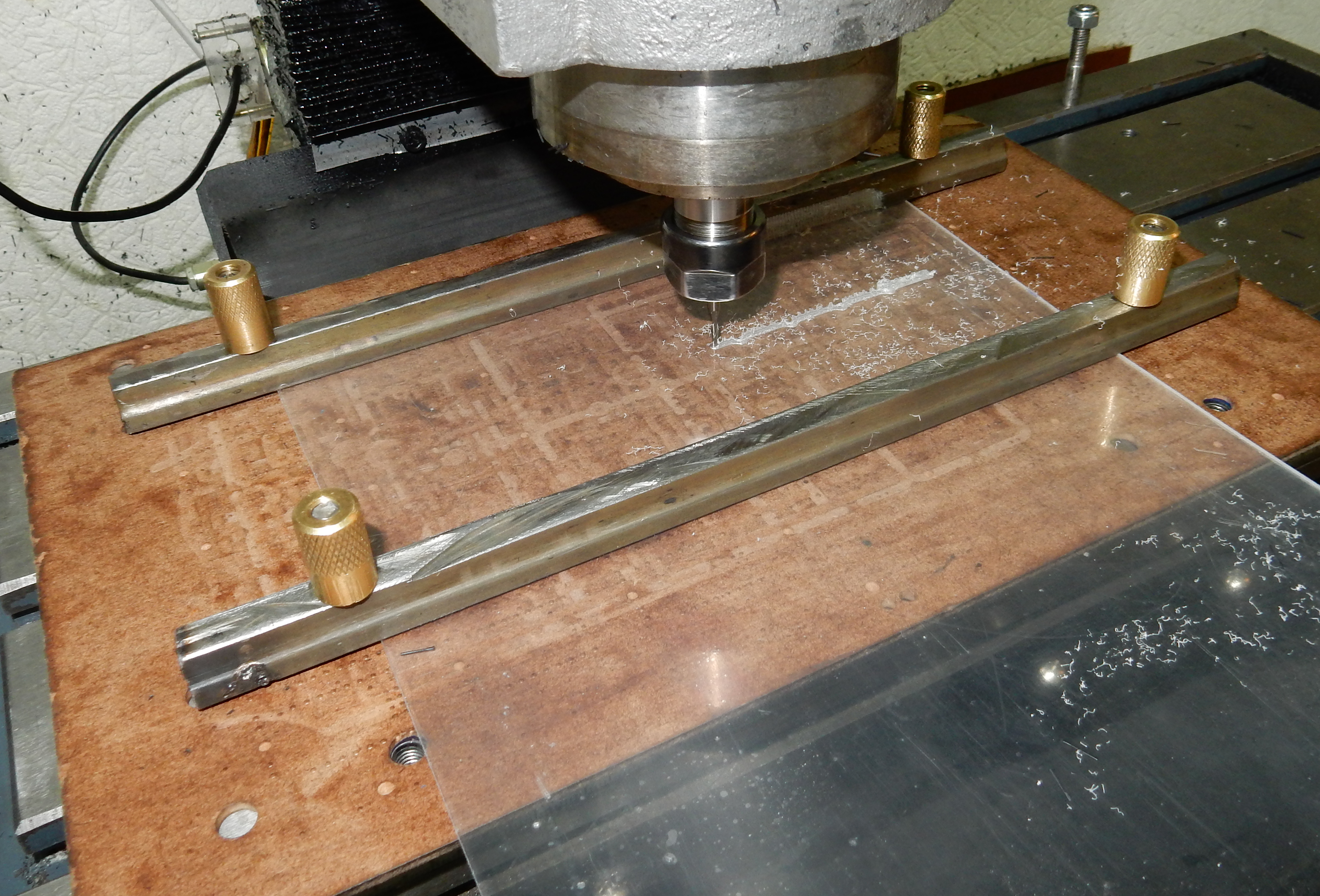 Конкретно это стеклышко нарисовано и размножено в Нанокаде и обработано SheetCAM. Обработка идет по слоям, а не деталь за деталью, чтобы до последнего момента не нарушать целостность заготовки.