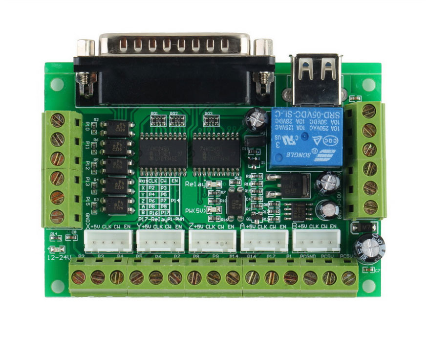 Зелёная плата. На ней есть джемпер (слева от рэле). В зависимости от того, стоит он или снят, плата управляет либо 4-мя осями и скоростью шпинделя либо 5-ю осями(без возможности регулировать обороты шпинделя). В обоих вариантах позволяет управлять рэле. До регулировки скорости шпинделя еще руки не дошли(а может и не дойдут), пока работает просто с драйверами двигателей и управляет включением/выключением шпинделя.