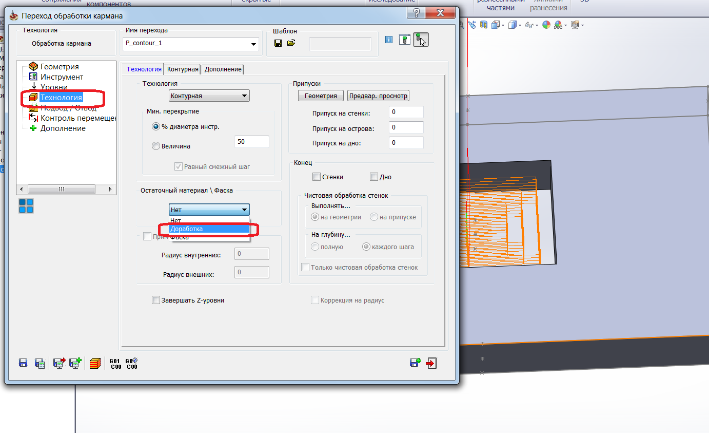 shalek писал(а):Нашел доработку, но почему-то на размер ругается. Пишет, что диаметр предыдущего инструмента должен быть больше. Ввожу 1мм - ругается. Прописал 7мм - построил траекторию. Как это доработку большим диаметром?
