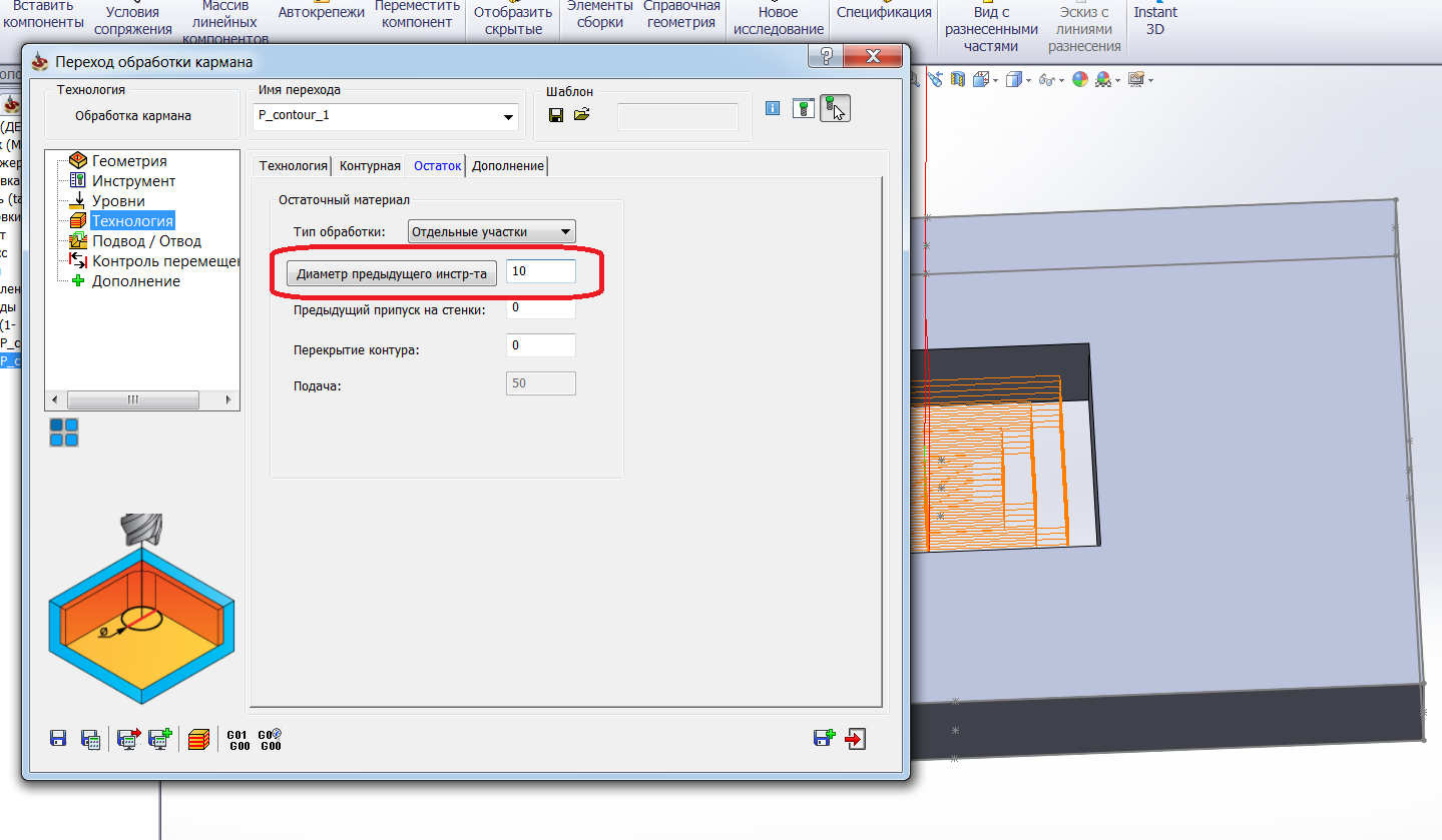 Дообработка делается меньшим инструментом. Если первым инструментом ты выгрызал ф10мм, то дообработка делается скажем ф2мм. Он просит вести какой инструмент был до дообработки, а это 10мм(в моем примере).