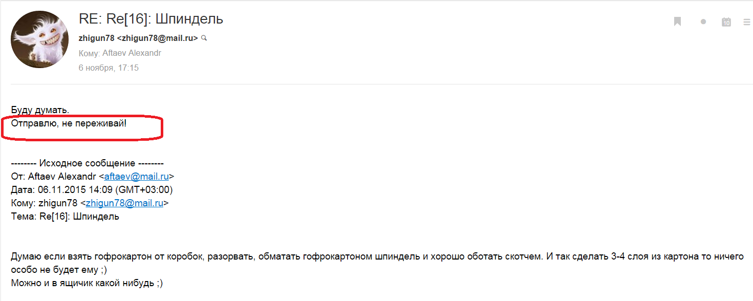 Но договариваемся так - что оставшиеся 15000 рублей я доплачиваю ПОСЛЕ получения шпинделя. И даю свое честное слово на форуме: