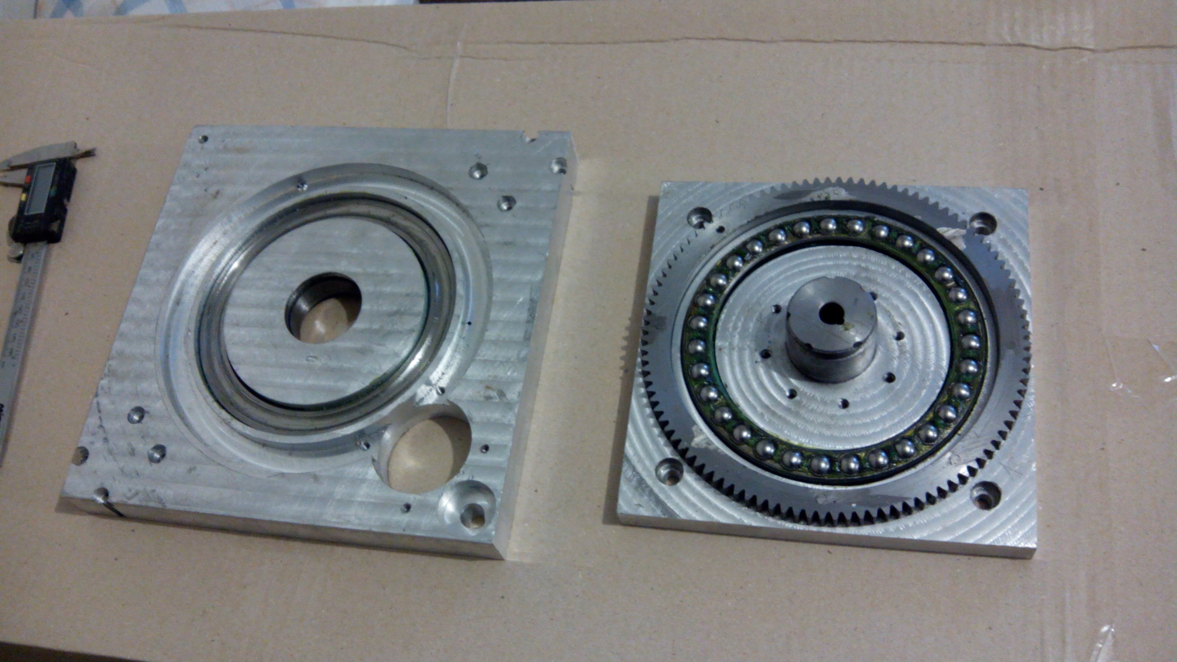 Собрал на базе ТП-40-1 пяти осевой токарный станок, управление Кфлоп- Кмоушин, драйвера ЕМ806, питание импульсник 70В. Механика - по линейным осям XYZ швп 2010 и ШД 34HS4802 NEMA34, поворотная ось А(вращение патрона) ШД 57типоразмера с волновым редуктором 1:50, Поворотная ось В (вращение платформы шпинделя) ШД 57типоразмера с волновым редуктором 1:50,который закреплен на поворотной платформе, на вал редуктора посажена 13 зубая шестеренка. На оси Z намертво прикручено зубчатое колесо на 100 зубов по которому и вращается 13-ти зубая шестеренка. Вся механика довольно жесткая, двигается плавно без люфтов и вибраций. В принципе все меня устраивает, но вот сегодня дело дошло до написания постпроцессора под мою кинематику, с постом тоже как бы проблем не возникло, написал в повермилле для теста небольшую УП для проверки В оси, кончик фрезы должен жестко стоять на месте, а ось фрезы изменить свое положение от -45 до 45 градусов, но на станке кончик фрезы как то движется по небольшой дуге и как то волнообразно, рывками, хотя если крутить ось В саму, то вращение плавное без каких либо рывков и вибраций, так же линейные оси движутся равномерно и без вибраций и люфтов, а вот если передвигать одновременно 3 оси, то кончик фрезы движется как то волнообразно, то чуть замедляется то разгоняется. В чем может быть проблема? Механика или софт? Может кто сталкивался с подобным.