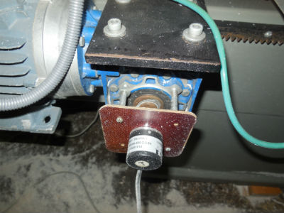 На вал с ведущей шестерней (которая бегает по зубчатой рейке) установлен дешевенький энкодер (вроде на 400 шагов).