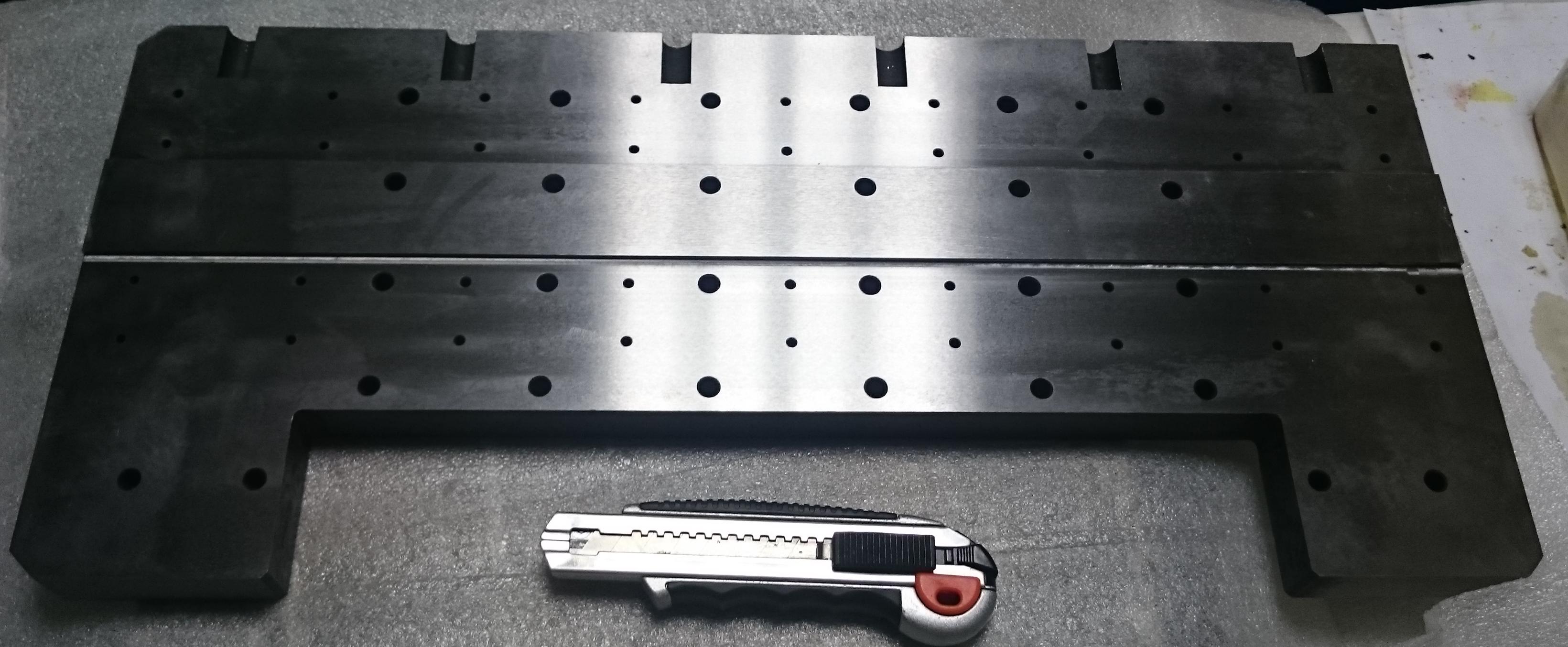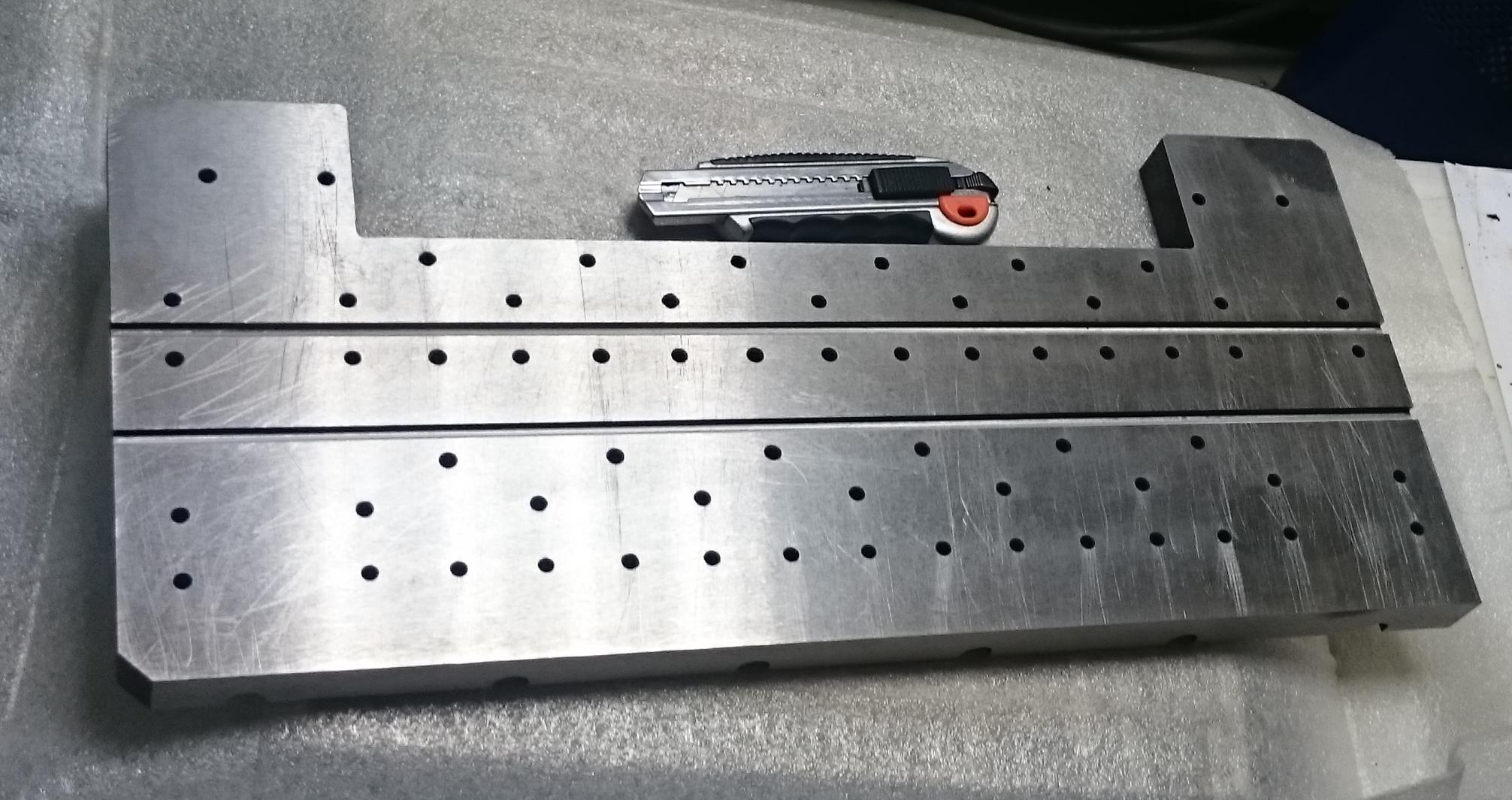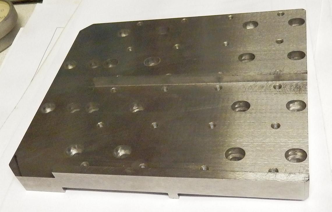 Верхняя плита. продольные пазы - базы для установки инструментальных модулей. три позиции "в глубину" - по передней кромке, и по двум пазам. плюс два модуля встанут под 90 градусов на "ушах". туда уйдут отрезной и наверно попробую мелкий шпинделек воткнуть. но это уже по ходу определится - самому станку навесной инструмент не относится..