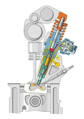Под маленьким поршнем создаётся большое давление,а электронный клапан в нужный момент впрыскивается топливо в цилиндр.