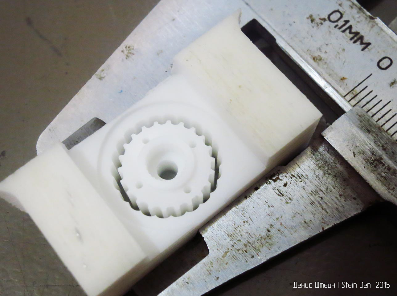 Еще одно изделие, где я использовал свой датчик длины инструмента - зубчатое колесо для ремня MXL для серводвигателя. Деталь очень маленькая. Работал фрезой 0,5мм и сверлом 0,25мм.