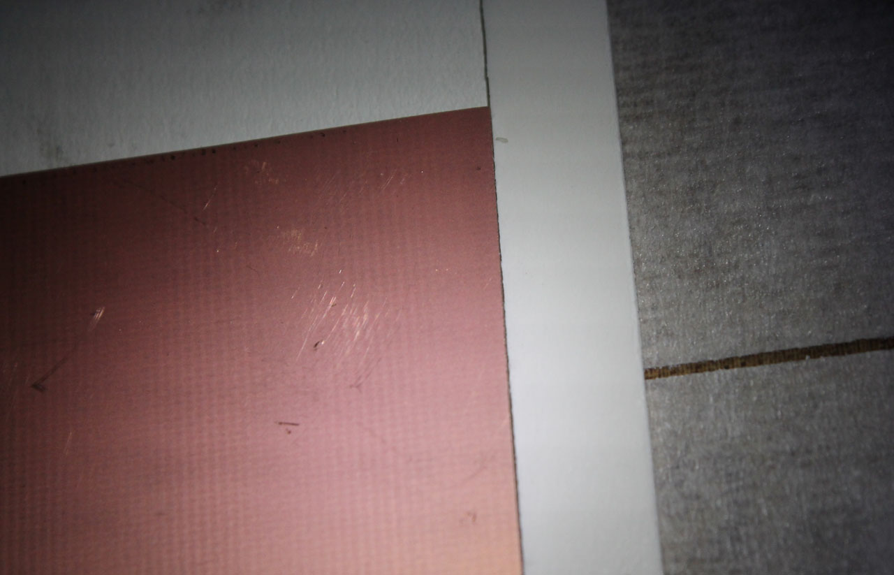 Теперь лепим скотч на гравированную сторону, переворачиваем плату по горизонтали и аккуратно укладываем ее в карман, так же как и перед обработкой первой стороны – прижимая плату в угол и к выступам, чтобы стороны платы плотно прилегали к ним: