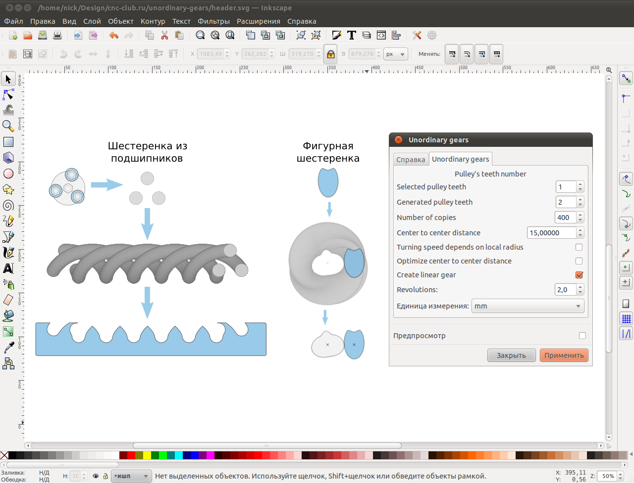Unordinary gears это расширение векторгного графического редактора Inkscape, предназначенное для создания необычных или фигурных шестеренок. Мы привыкли видеть круглые шестеренки, но иногда становится скучно и хочется чего-то особенного, ведь вокруг столько много разных форм :). Unordinary gears рисует ответную шестеренку для произвольной фигурной шестеренки заданной пользователем.