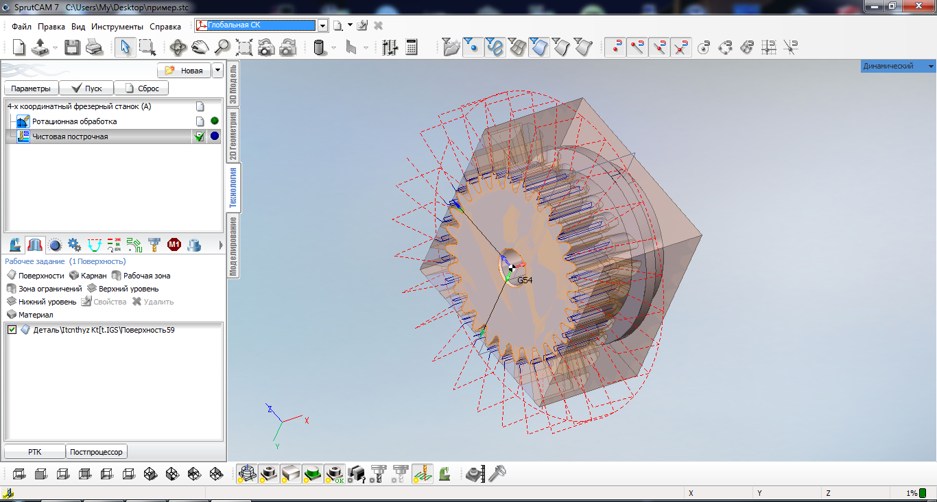 Маюсь второй вечер .не могу заставить SprutCam 7.1.6 выполнить ротационную обработку конической фрезой. Он постоянно делает непонятный завихрения с обоих торцов шестерни. (К слову Powermill ведет себя так же) . Видимо что-то не учитываю в настройках траектории. пробовал создавать прямоугольник в 2Д редакторе и обзывать его рабочей зоной- ноль эффекта . Пробовал указать торцевые поверхности как зона ограничений -ноль эффекта.