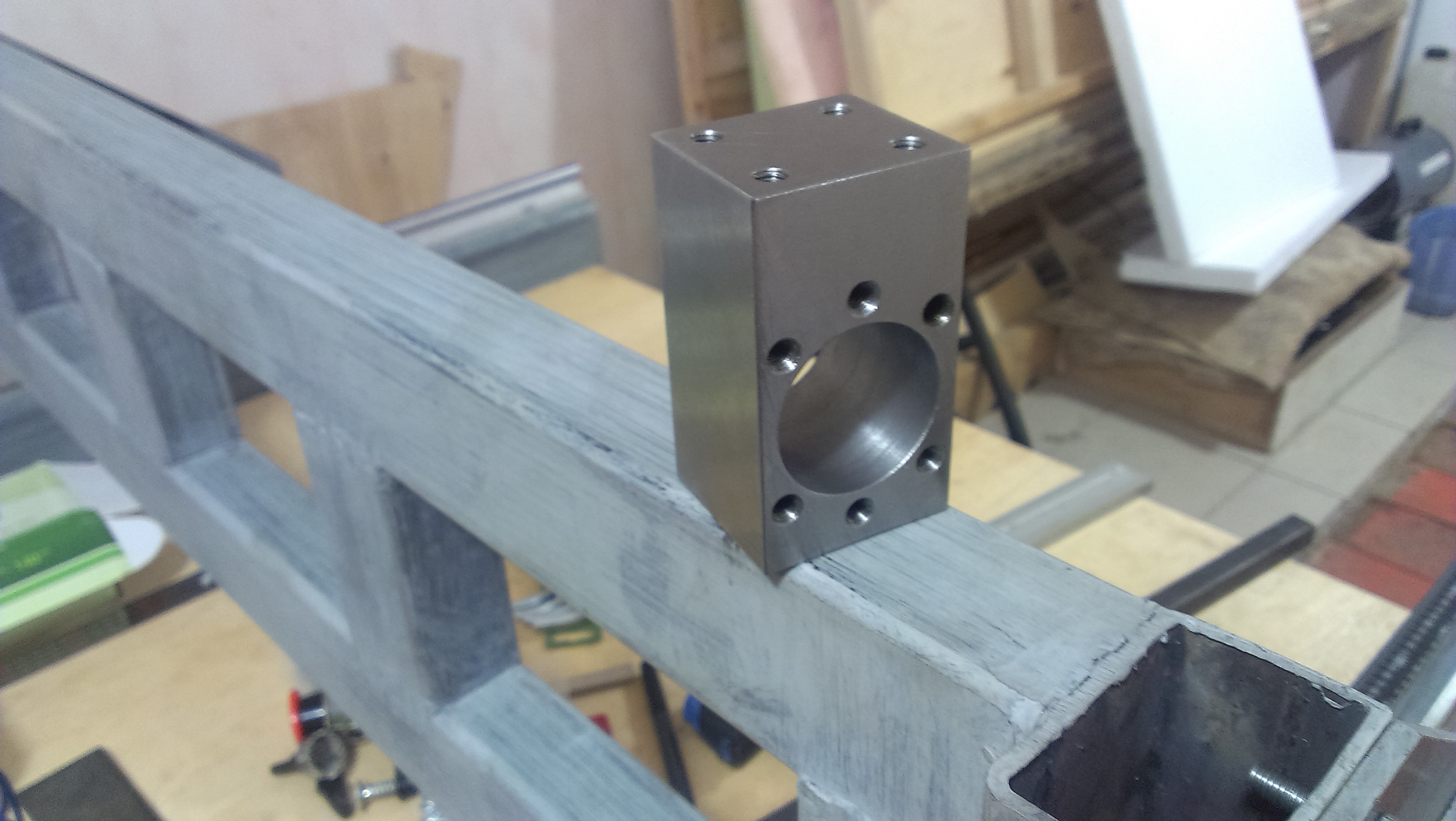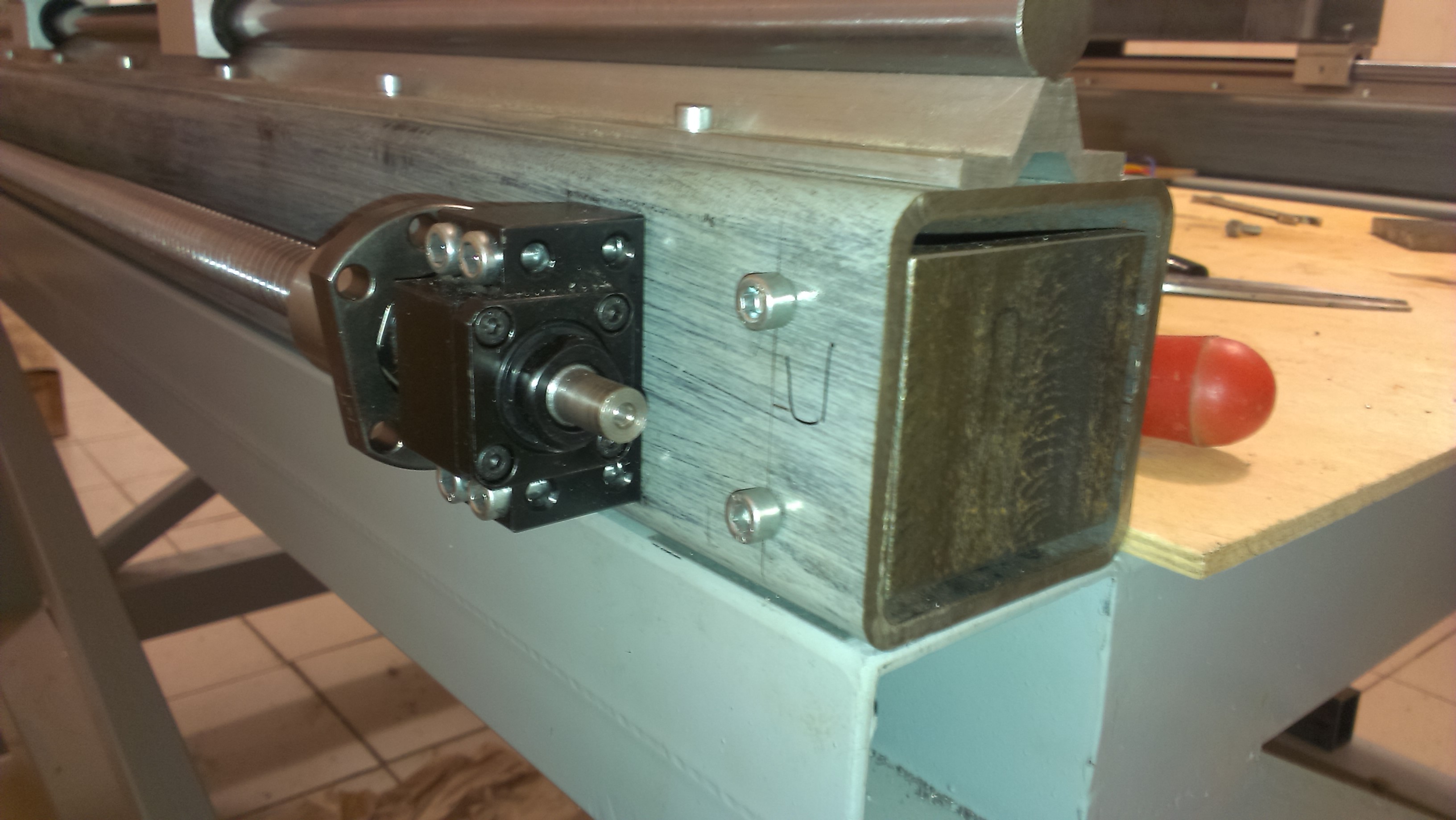 Следующим этапом были винты ШВП. Их крепление мне подсказал хороший мой знакомый. Аиподсказал он мне вот что. Под модули крепления ШВП сделал пластинки из металла с резьбой под крепежные болты. А в месте крепления модуля отверстия немного большего диаметра чем болты, для того чтобы при отпущенных болтах креплением можно было играться и выставить как необходимо. Думаю по фоткам будет понятно как и что!