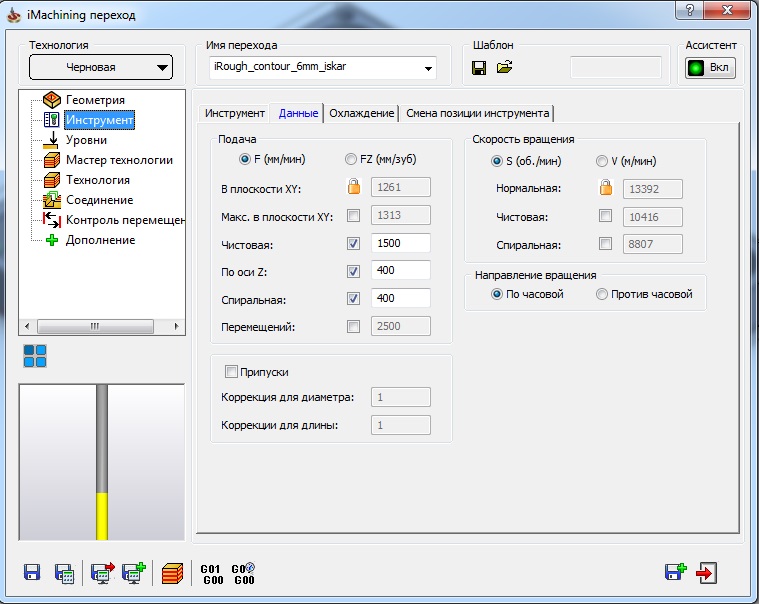 Думаю прощу скринами все показатьДрюня писал(а):Какой выставляешь боковой шаг, глубину, подачу на зуб, скорость подачи и шпинделя, контроль стружки, уровень обработки?