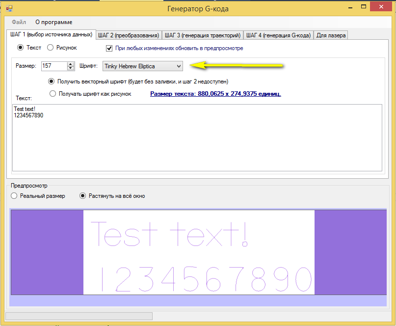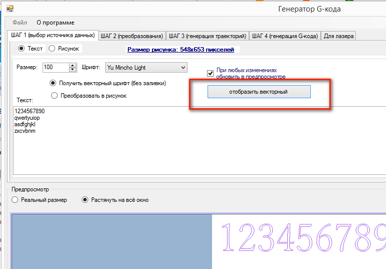 Сейчас преобразование текста сразу в вектор работает только для предварительного просмотра, дальше пока ещё не сделал, но кто хочет может проверить пока правильно ли мой алгоритм извлекает вектора из шрифта, прилагаю программу: после ввода текста нужно: нажать эту кнопку