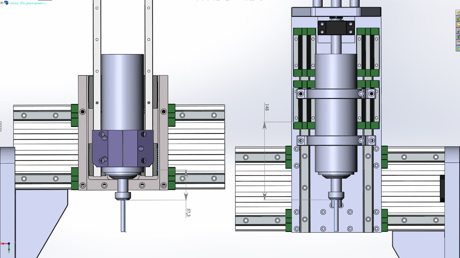 Я имел в виду не компоновку с рельсами на оси, меня заботит большой вылет шпинделя в твоём проекте. Посмотри на первый свой эскиз и на примеры, которые ты приводишь позже. Есть разница?