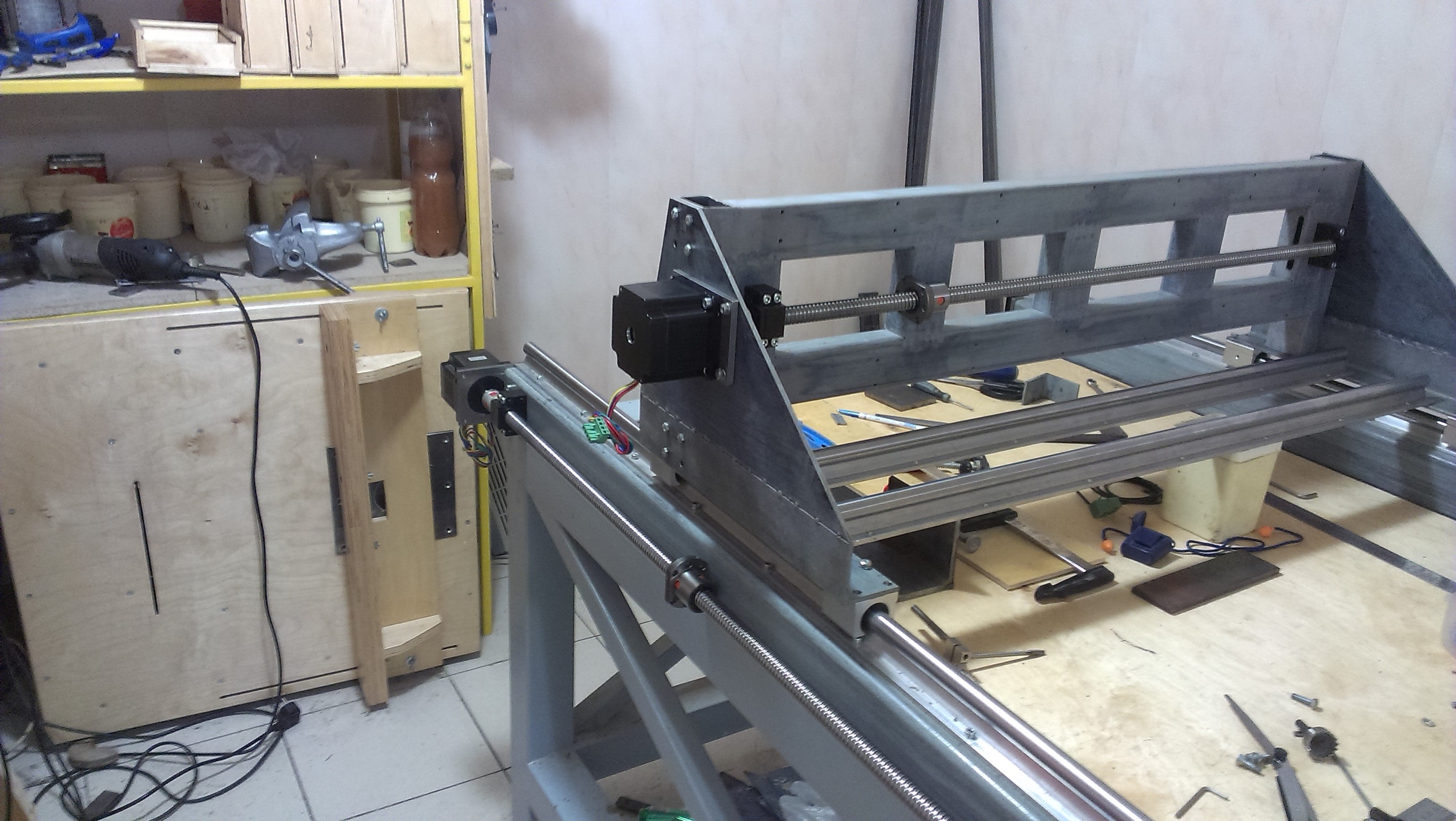 Далее. Наконец то фрезеровщик сделал мне площадки под двигатели. На работе дали отпуск. И я начал усердно работать над станком. Первым делом собрал ось Z. Приварил площадку под двигатель. И подключил к компьютеру. Ну так поигратся! Да к стати к этому времени я приобрел лицензию на мач и русификатор.