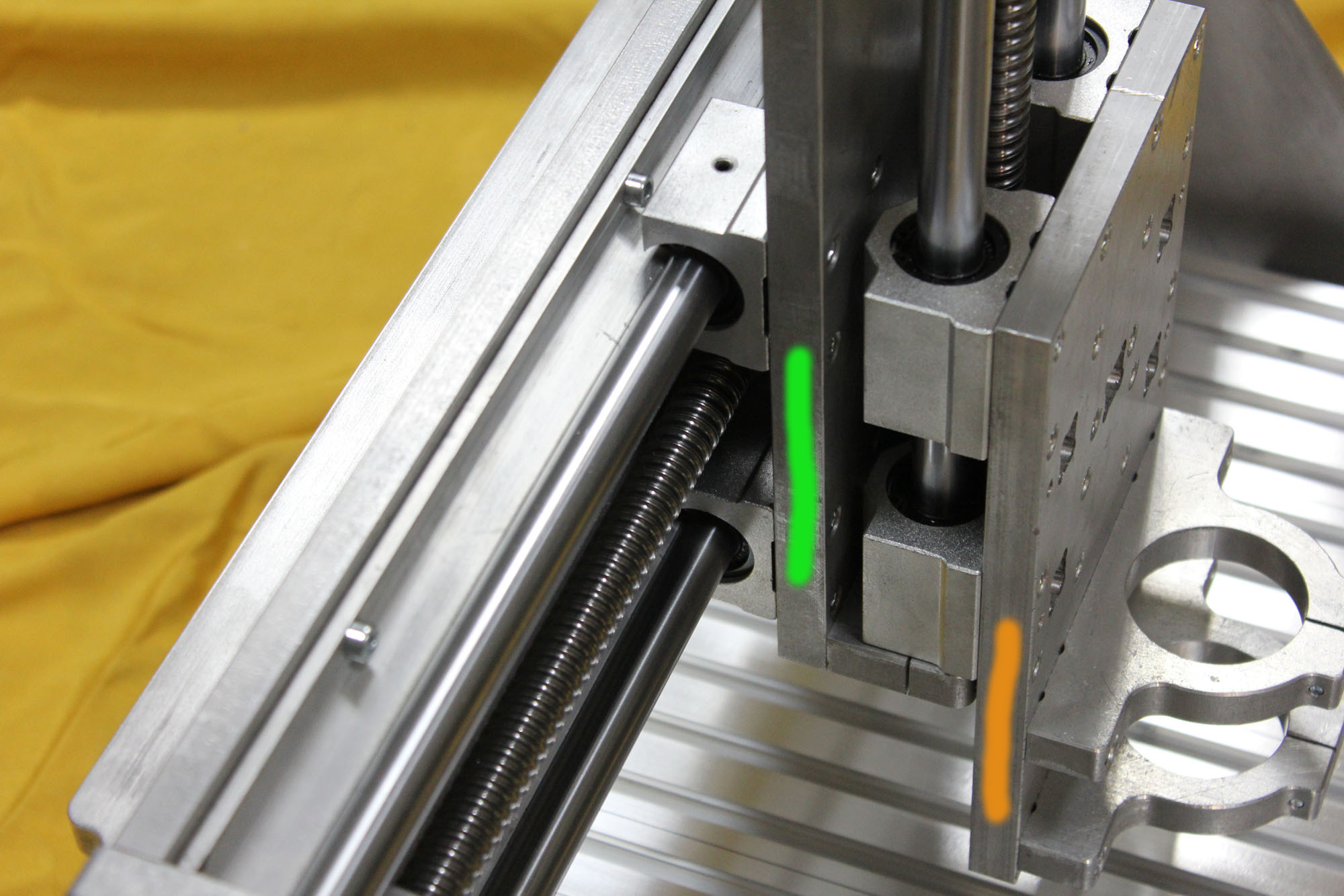 Из инструментов у меня только строительный уровень и угольник(не факт что углы строго 90/45), но портал относительно стола станка и пола достаточно ровно + я его не разбирал. Так же платина, которую я на рисунке отметил зелёным - параллельна порталу. А вот оранжевая явно нет.