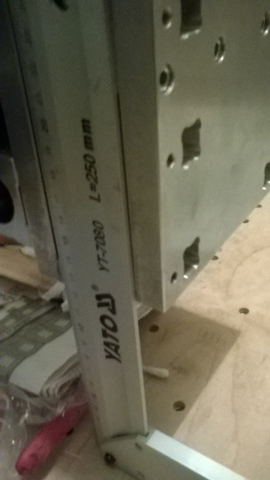 На фото не очень видно, но плита не параллельна угольнику, и если попытаться сдвинуть его на плиту, то он упрётся в нижний её край. Проверял и уровнем, и угольником - всё визуально параллельно и перпендикулярно, кроме этой плиты.