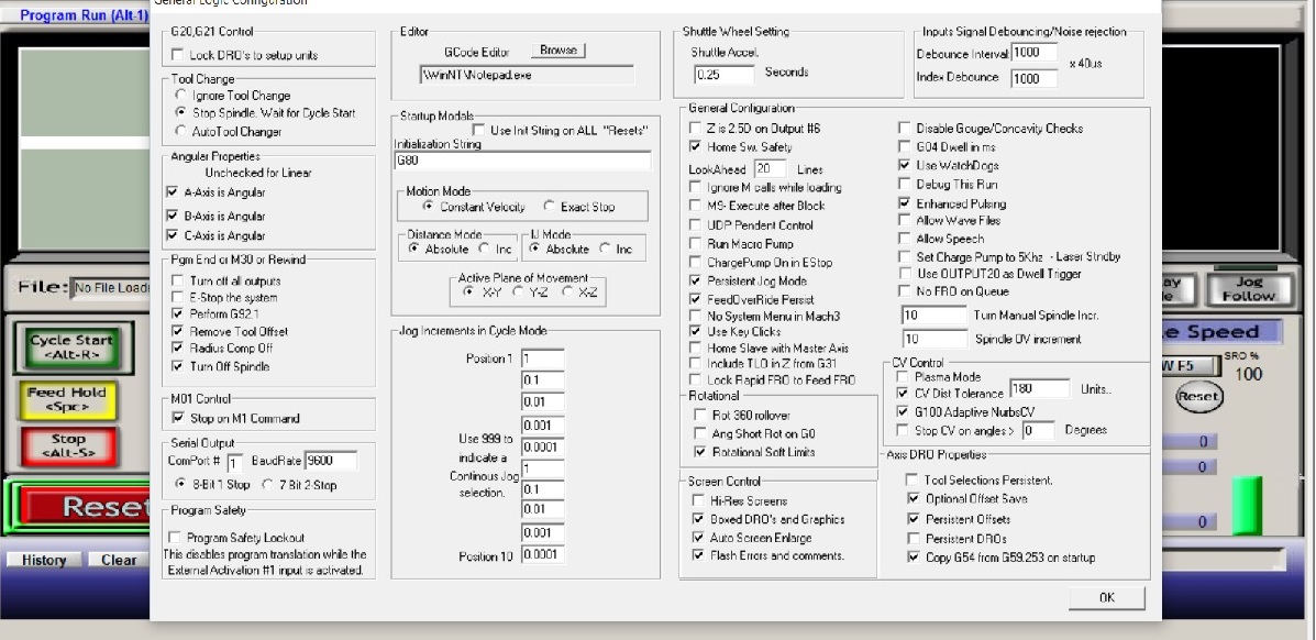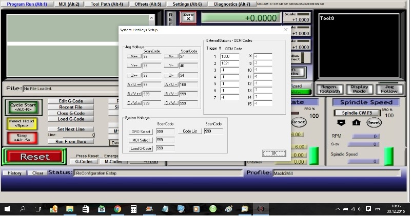 Когда запускаешь Mach то кнопка сразу моргает я нажимаю как написано . На диске шел файл В папке иероглифами Mach3Mill.xml.и 1024.set. Я помещаю и один и оба в папку с программой и появляются настройки моторов и портов. Но проблема и с этим фалом, и без него, и при настройке руками, и нашел в инете подобный фал, кто то выложил, он конечно не к моему станку но та же проблема.