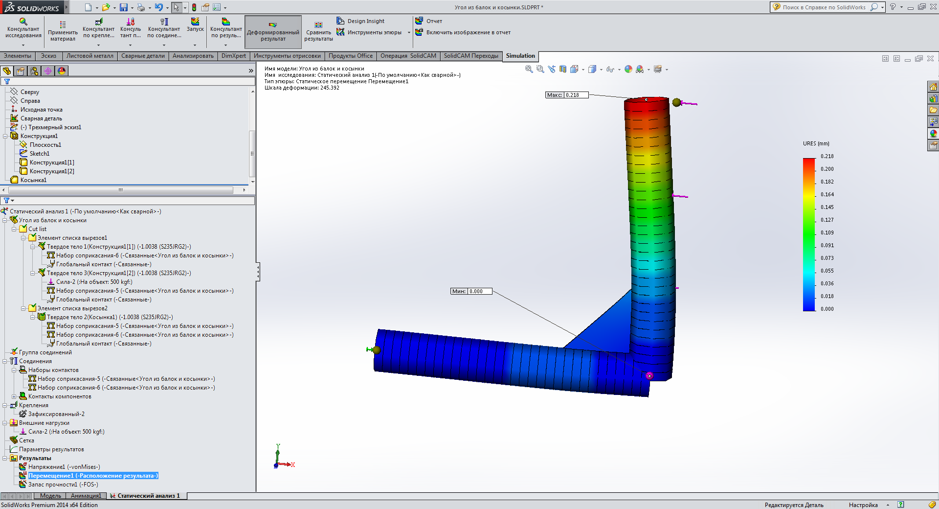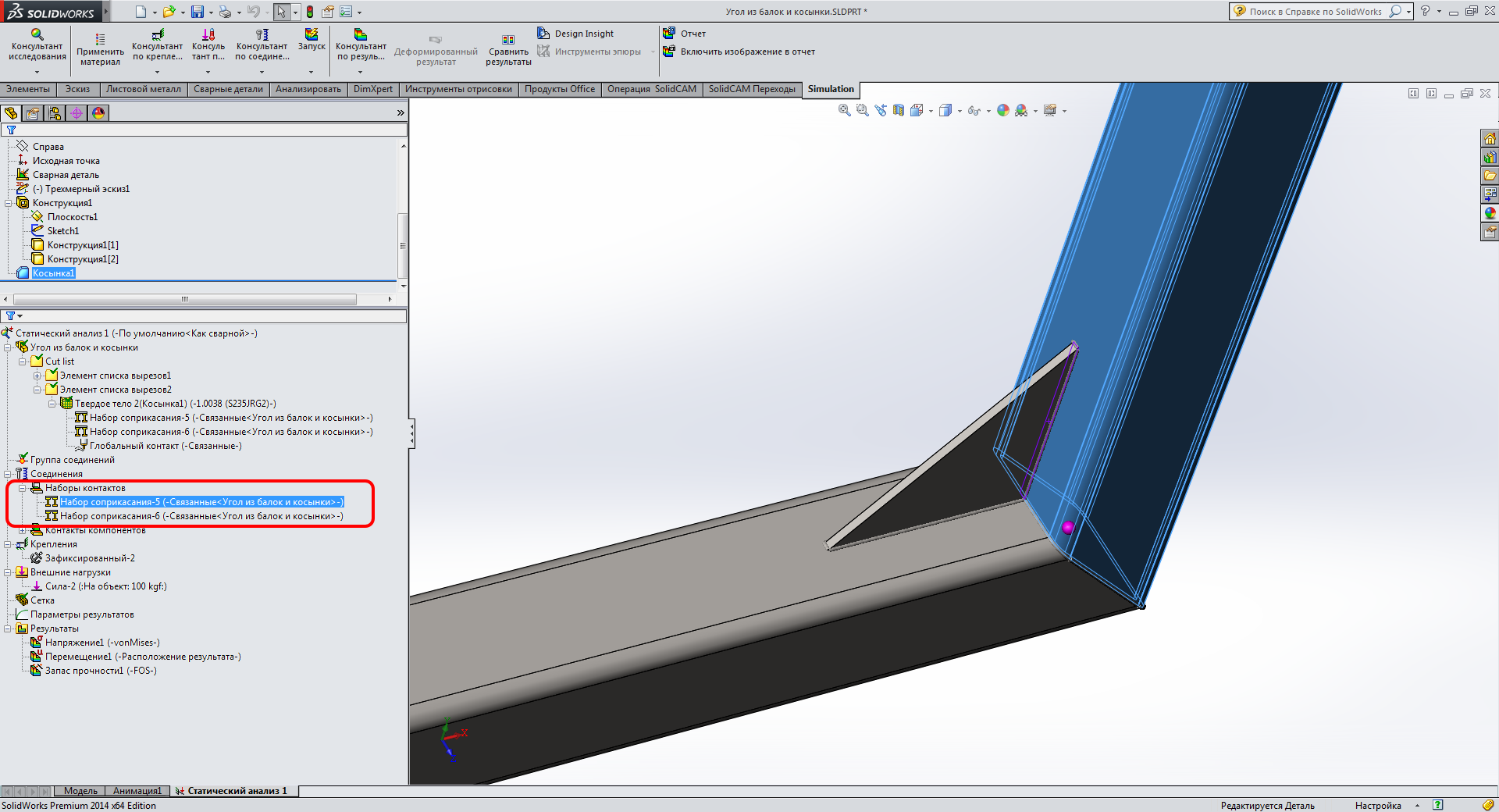 Помогите создать статический анализ простой конструкции - две балки под углом соединены + косынка приварена.