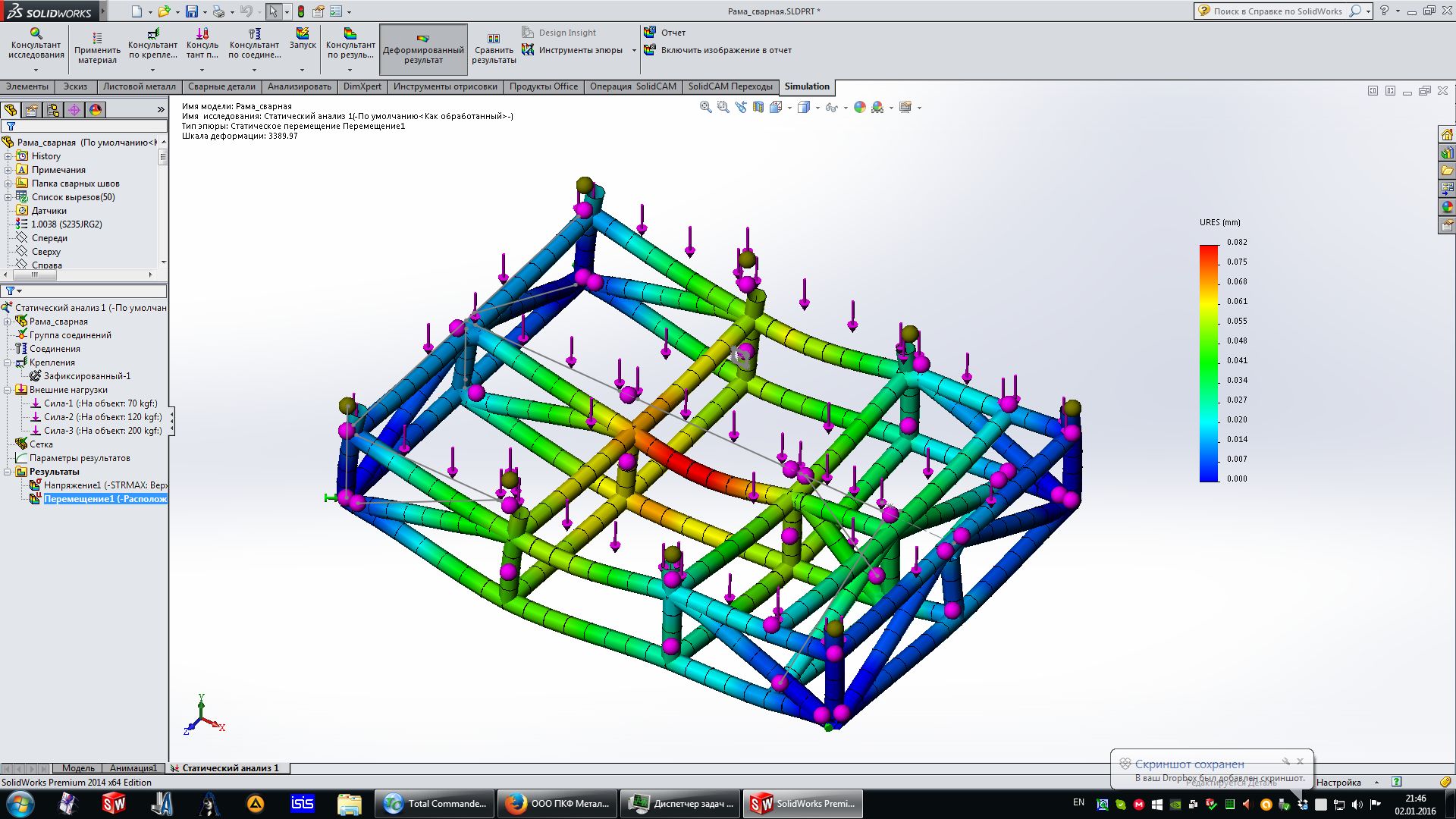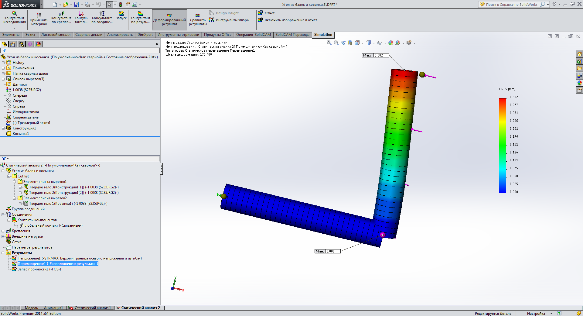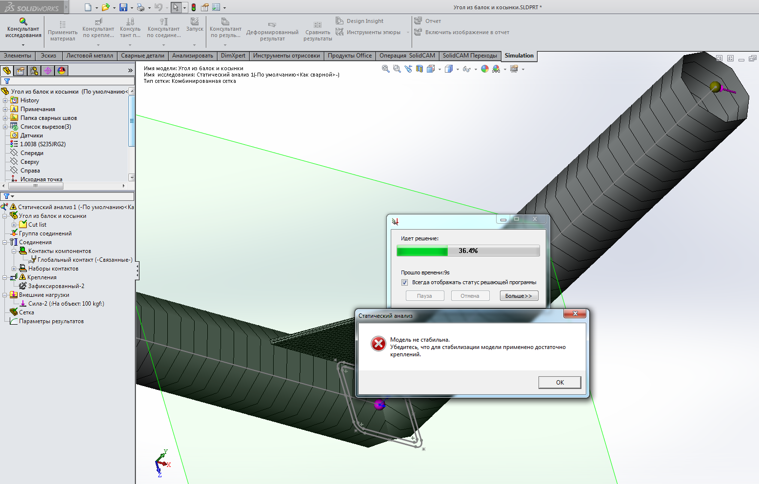 Помогите создать статический анализ простой конструкции - две балки под углом соединены + косынка приварена.