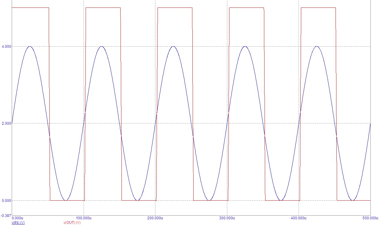 V1 - питание 5 вольт, V2 - ИОН 2 вольта, V3 - источник синусоидального напряжения размахом 4 вольта.