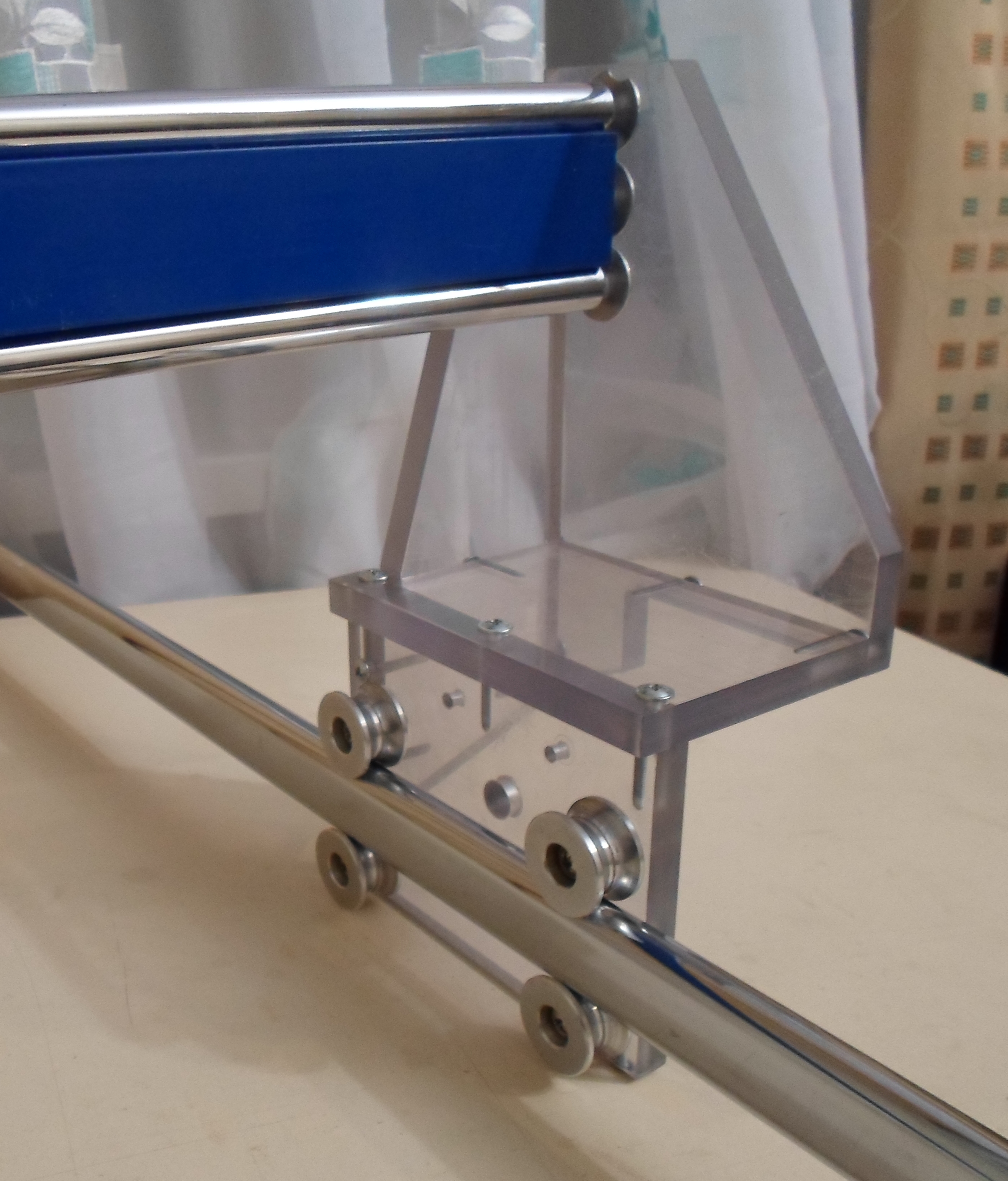 Синяя палка это кусок Ал.профиля для торгового оборудования, конструктив - поликарбонат толщиной 12 мм, ролики - Д16 (два подшипника 5х13х5 ), посажены на межсекционные стяжки. Шпильку ( в профиле ) планировал использовать в качестве рейки :idiot: , но она будет убираться - один приятель подогнал мне на халяву три ремня с шестерёнками ( ширина 10, шаг не мерил, мелкий )