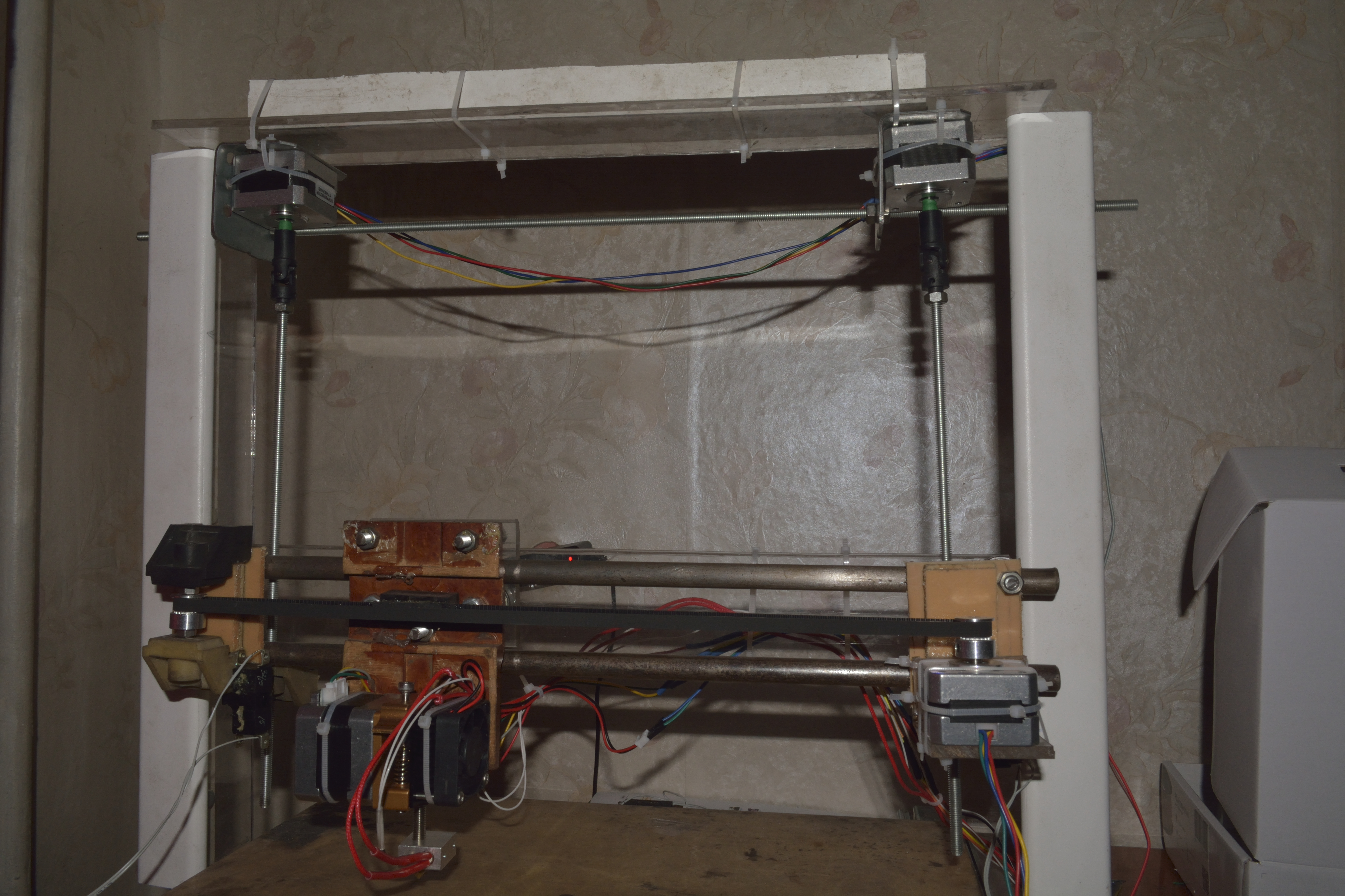 Наконец, несколько дней назад пришли шаговые двигатели, поставил, опробовал всё в норме, собрал, откалибровал и запустил печати без материала, сначала ни в какую ни хотел греться HotEnd, отдельное спасибо Raptirius , подсказал в чем дело, дело в том что не поставил термистр на HotBed , так как запуск с расчетом холодного стола , но и пришлось поменять прошивку.Осталось поставить стол на пружины.....))) Да, хотел спросить, может где можно изменить значение расстояния между соплом и столом при печати первого слоя, дело в том, что, при запуске печати каретка X подымается по оси Z на 1 см с лишним от концевика HOME и происходит печать первого слоя , ну и естественно печать следующих слоев происходит в зависимости от G кода или можно настроить только концевиком ?!