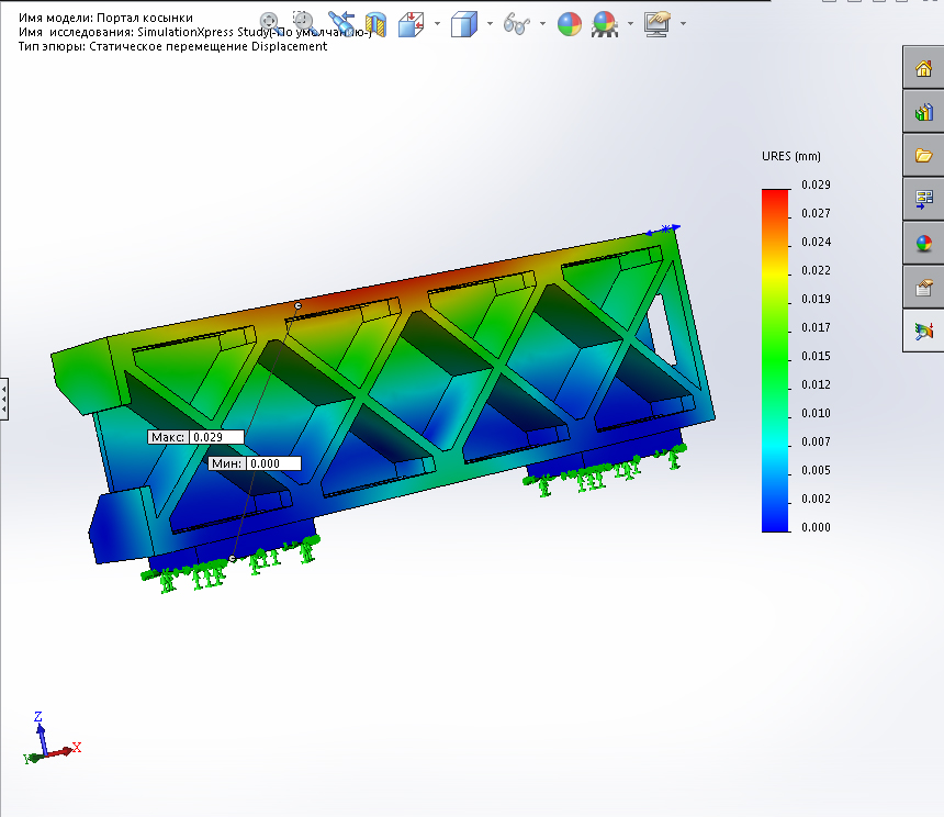 Приложил силу в 1000N в сторону портала и 1000N от портала на площади примерно равной площади контакта кареток с рельсами. зафиксировал портал жестко в местах крепления стоек портала. (вес портала с сотами на 2 кг больше)