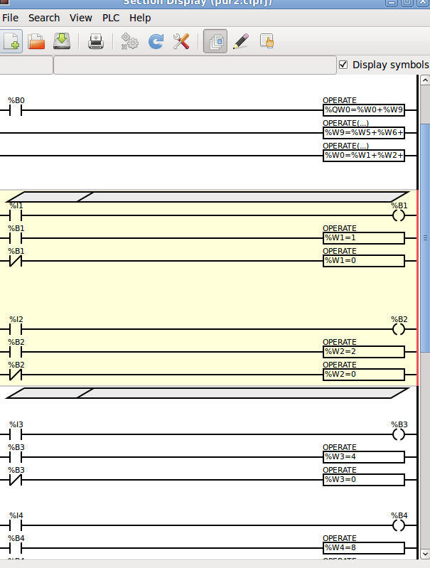 Я вот пока на ладдере схемку набросал: (можно прилепить задержки для надежности)Nick писал(а):делаем обработку %QW0 = %QW0 + 2^x где 2^x - представление номера реле. ее подключаем к ----%i01| |--- перед всем этим ставим %QW0=0 И ко всему этому подключаем условия ---%IXX|/\|-- или ---%IXX|\/|-- т.е. растящая или ниспадающая грань сигнала.