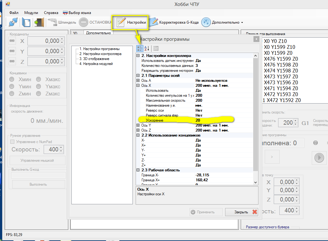 Добавил посылку настроек в контроллер при каждом старте выполнения G-кода, но пока не было возможности протестировать...