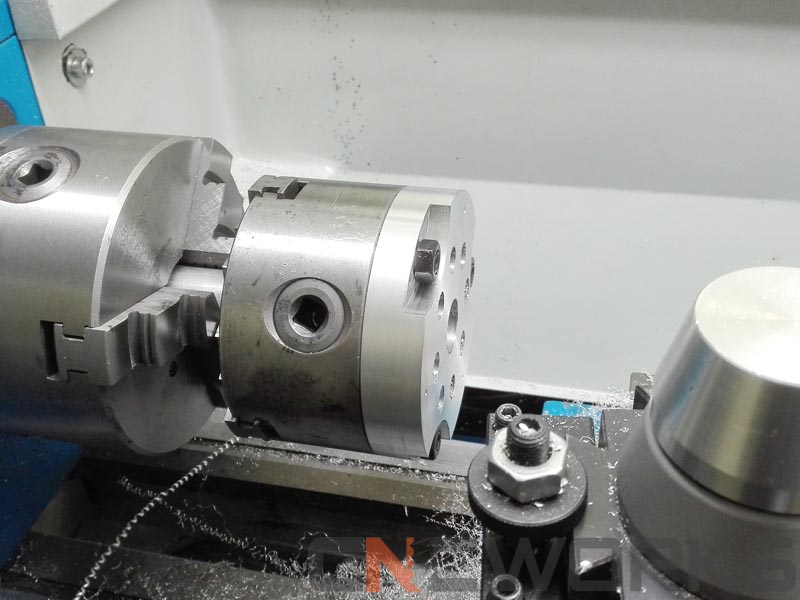Для получения наименьшего биения патрона на поворотной оси, планшайба протачивается, торцуется сразу на патроне. Т.к. в самом редукторе есть отверстие 20мм и в токарном патроне 20мм пришлось немного поковыряться с изготовлением планшайбы.