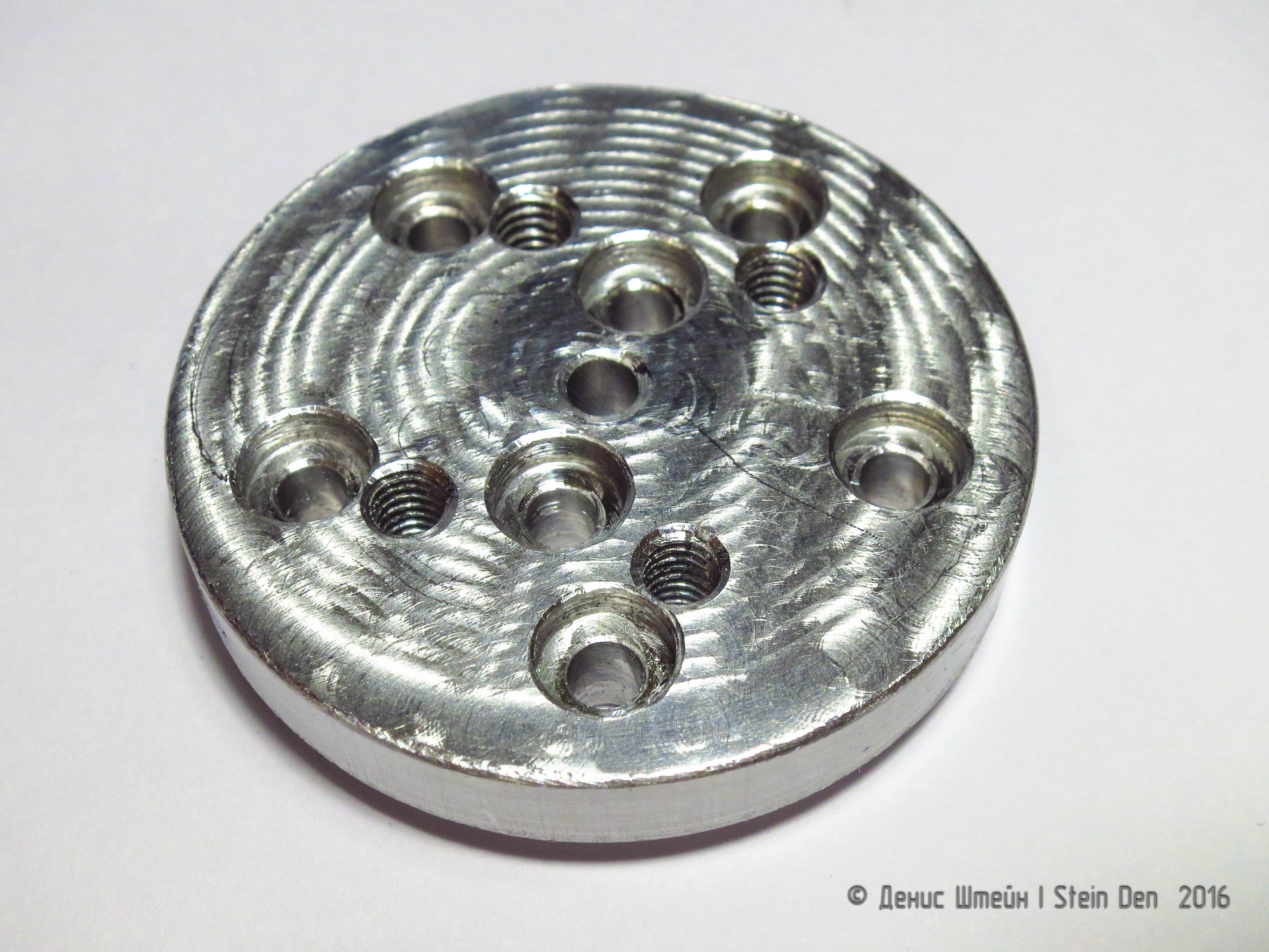 Получилось неплохо. Что больше всего обрадовало, так это то, что STL модель плотно вставляется в ротор, абсолютно отсутствуют зазоры и плоскость STL модели совпала с плоскостью ротора не хуже чем на 0,05мм. Учитывая, что колокол ротора имеет хитрые уклоны, я не ожидал, что удастся попасть настолько точно. Далее в отверстиях нарезал резьбу М3.