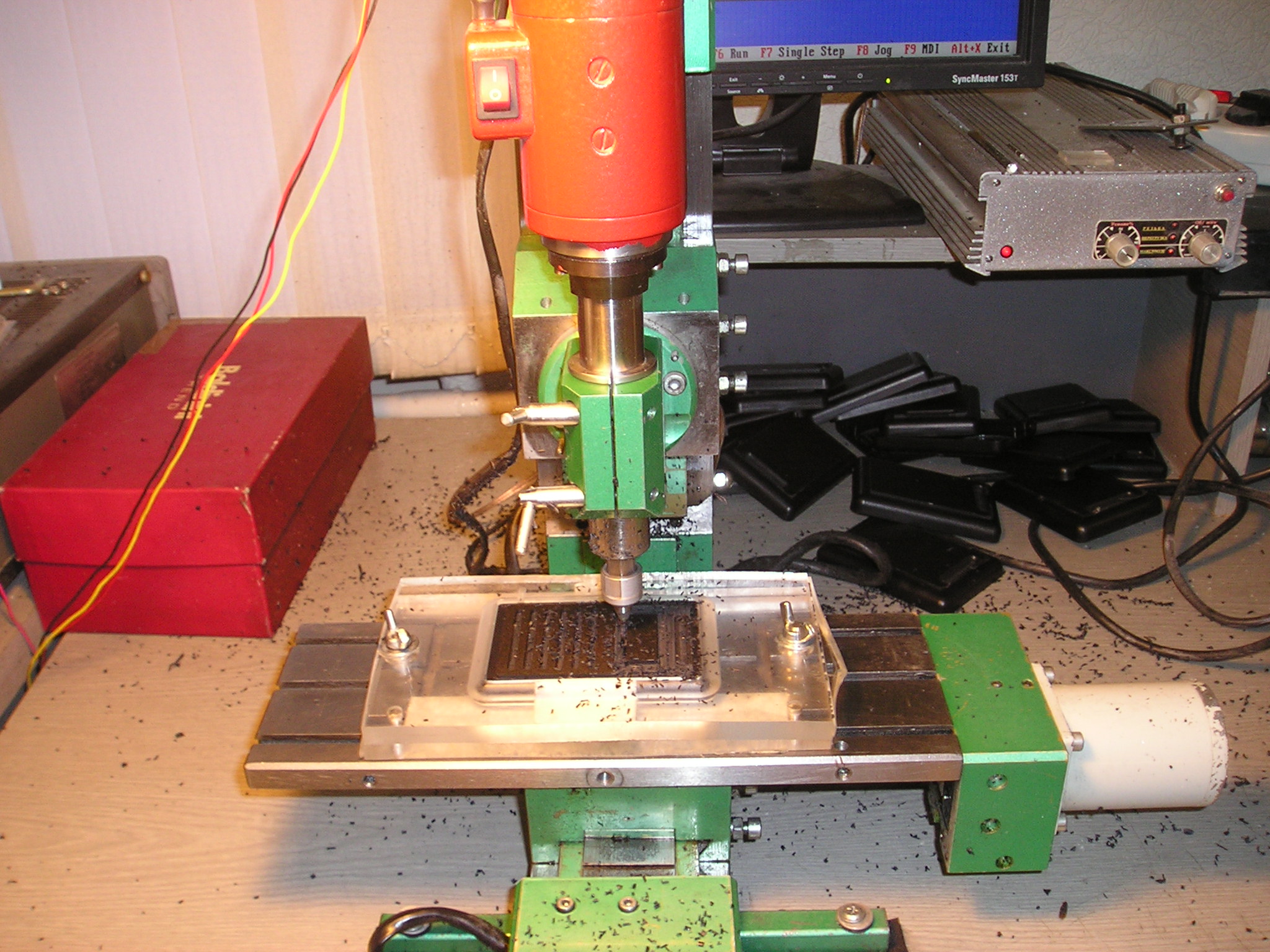 Ручками :) Программа останавливается по M0 с предложением сменить заготовку. Оператор убирает стружку (пылесосом), меняет заготовку в приспособлении и жмет Enter (TurboCNC). Хоуминг делается один раз при запуске программы, там же есть диалог настройки высоты фрезы над приспособлением. Повторная калибровка делается только при смене программы или сбое станка.