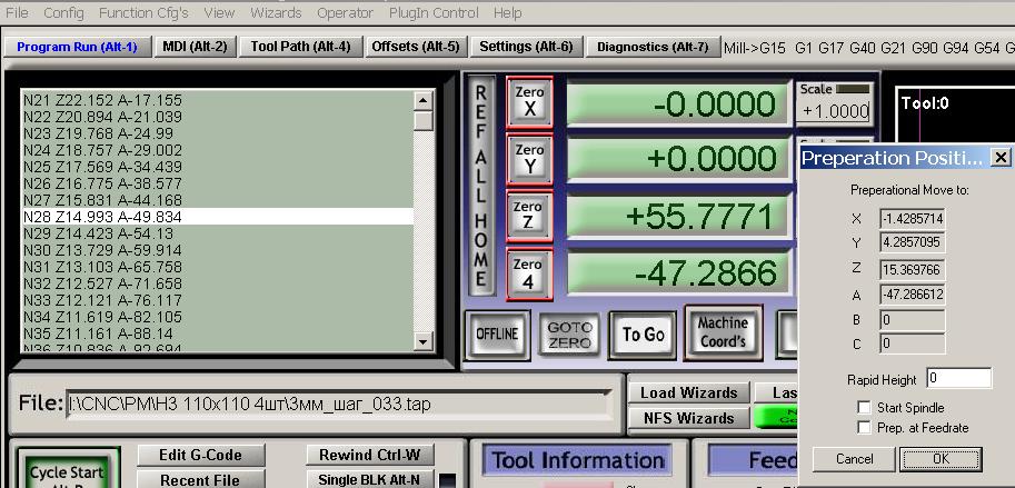 Такая проблема: возникла необходимость поставить на паузу (при работе четырех координат), станок останавливается, я делаю что мне нужно (осями в ручном режиме шевелю), потом нажимаю Start, появляется окошко с координатами в которых я нажал паузу, нажимаю Ок, и фреза по Z, вместо того чтобы вернуться в координату, предположим +35, едет в НОЛЬ!!! (просверливает заготовку), а потом возвращается в исходную позицию +35. Все замечательно, но в заготовке уже красивенькое круглое отверстие по диаметру фрезы аж до центра