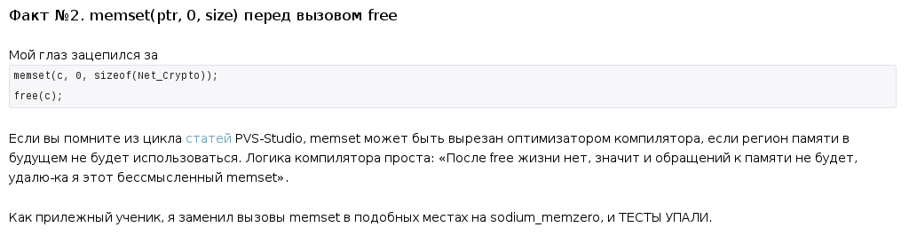 Если вы помните из цикла статей PVS-Studio, memset может быть вырезан оптимизатором компилятора, если регион памяти в будущем не будет использоваться. Логика компилятора проста: «После free жизни нет, значит и обращений к памяти не будет, удалю-ка я этот бессмысленный memset».