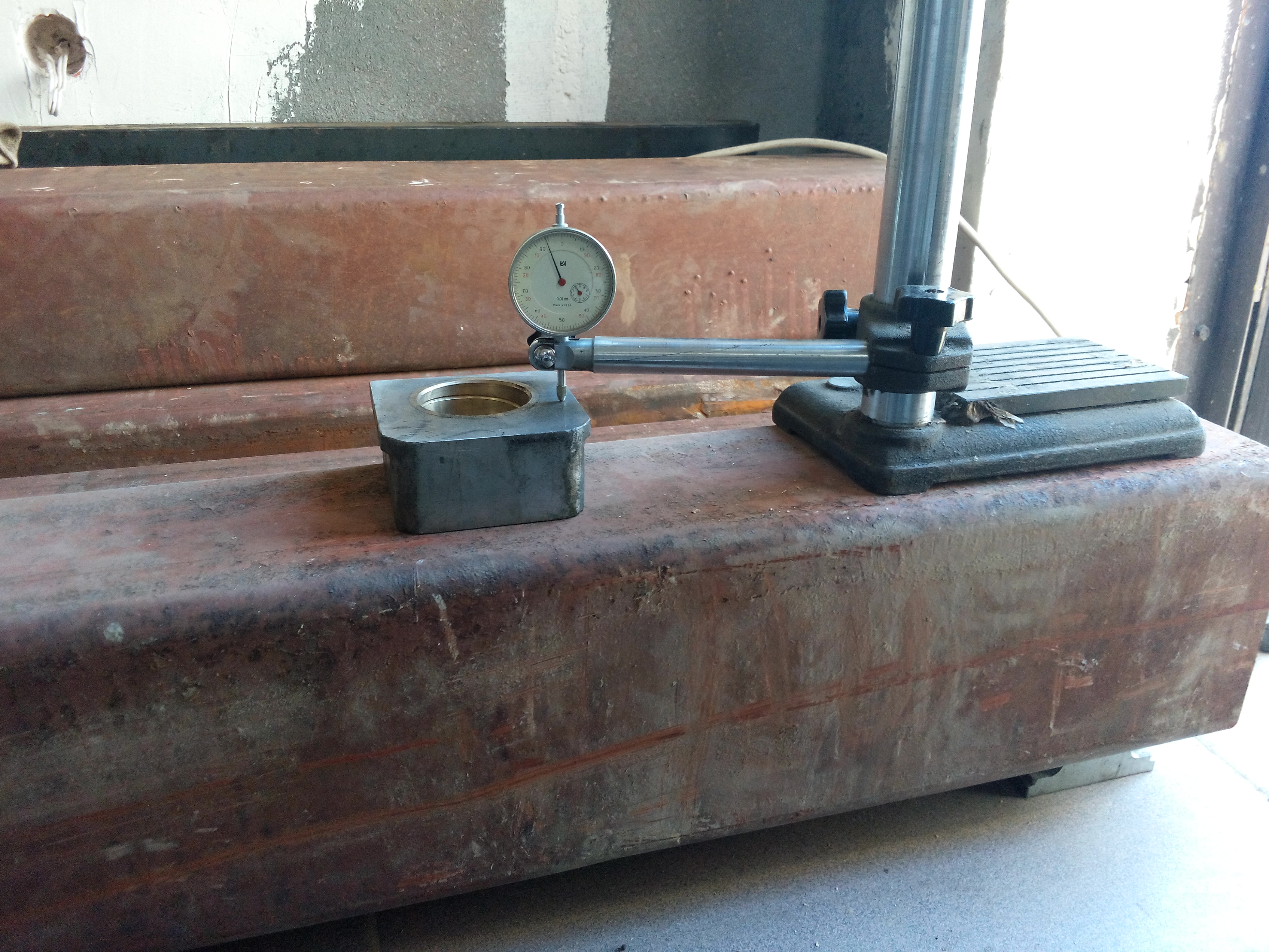 При моём весе 72кг, индикатор вообще не шевелиться если стойка на самой балке. Если на пол ставить стойку, уходит максимум на две шкалы(00,1-0.02мм).