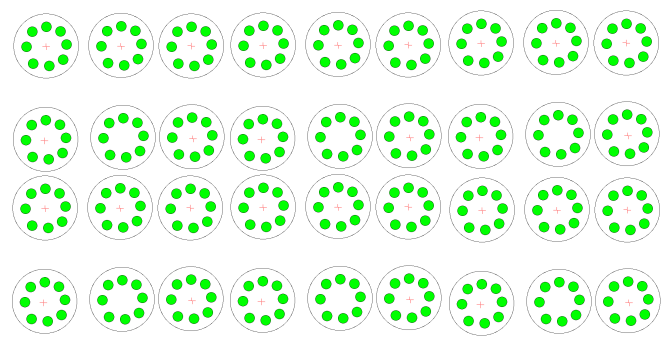 Есть у меня программа на мой старенький станок (управление РУХ4) с двумя подпрограммами. Первая зеленые кружочки фрезерует (на самом деле там не кружочки, а на капли острием к центру кружков направлены), а вторая вызывает первую нужное количество раз поворачивая систему координат. Вот рисунок для наглядности.